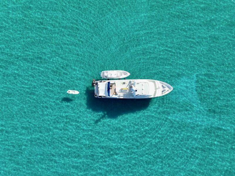 The deck layout is designed for adventure. The flybridge features a hardtop with helm station, hot tub, wet bar and ample C-shaped seating. On the boat deck, dedicated hydraulic cranes handle two sizable tenders (an 18’9” Egret with Yamaha VF115LA and a 17’ Hells Bay repowered in 2024), along with racks for kayaks/paddleboards and a Sea-Doo GTX Limited 300 (new in 2024). The aft deck provides teak dining for ten guests with steps up to the boat deck and down into the cockpit. The purpose-built fishing cockpit boasts 15 rod holders, a massive livewell, 600-lb/day ice chipper, fish boxes, extensive gear lockers and a 450-gallon gasoline fueling station. Forward, twin Steen windlasses handle two 1,100-lb stockless anchors with 720’ of chain each.