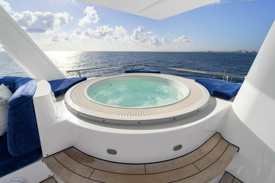 - Flybridge under a hardtop with full helm featuring Stidd chairs, hot tub, wet bar with sink and refrigerator, and generous seating areas