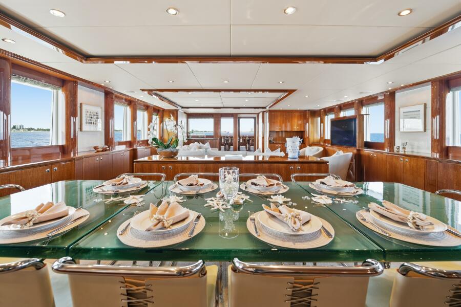 - Aft deck offering teak dining for ten with a hi‑lo table and built-in seating