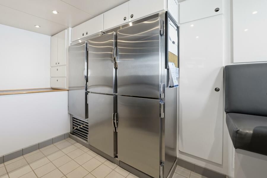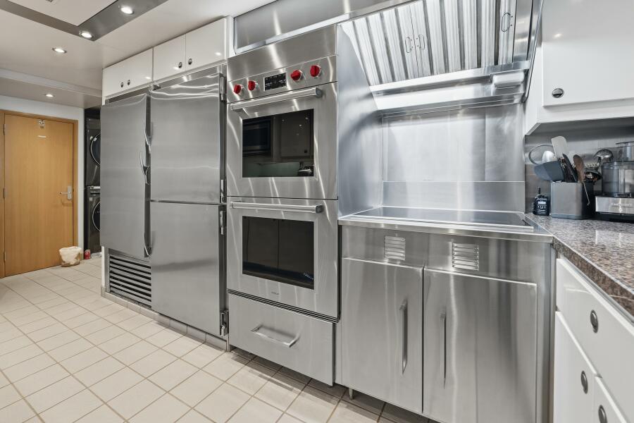 Crew accommodations support up to seven crew members, including a captain’s cabin with private head, port and starboard forward crew cabins with shared heads, and a crew pantry with full laundry facilities.