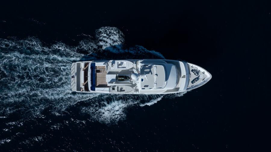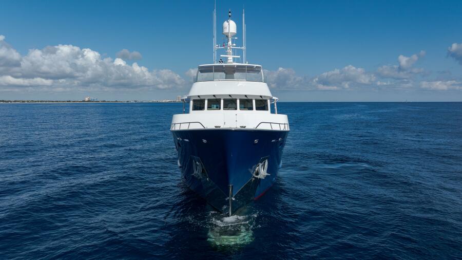 - Foredeck with twin Steen windlasses handling two 1,100-lb anchors with 720 feet of chain each and providing open space for sunbathing or working