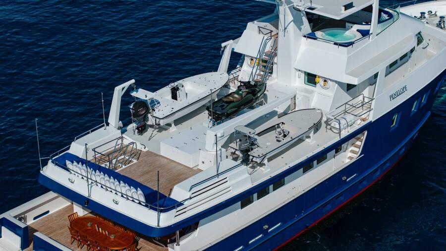 Penelope (ex Princess Gloria/Stampede) is a 118’ expedition motor yacht built by Delta Marine, originally delivered in 1990 and extensively refit in 2006–2008 and again in 2024. Built on a proven commercial fishing hull with GRP construction and a full-displacement form, she offers unmatched seaworthiness and efficiency. A 12-foot hull extension engineered by Delta Design Group created her signature fishing cockpit and lengthened her to 118 feet, transforming her into a serious sportfishing mothership as well as a comfortable family cruiser.
