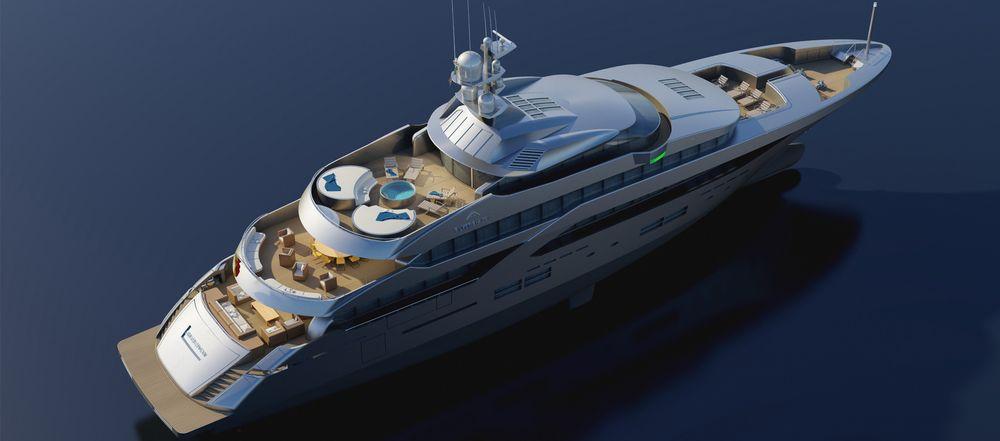 A skylight behind the bridge allows the sun to shine into the well-equipped gym that leads to a vast open-air terrace with a wet bar and a round swimming pool for sunbathing. This yacht has everything that is needed to make life on board as pleasant as possible.