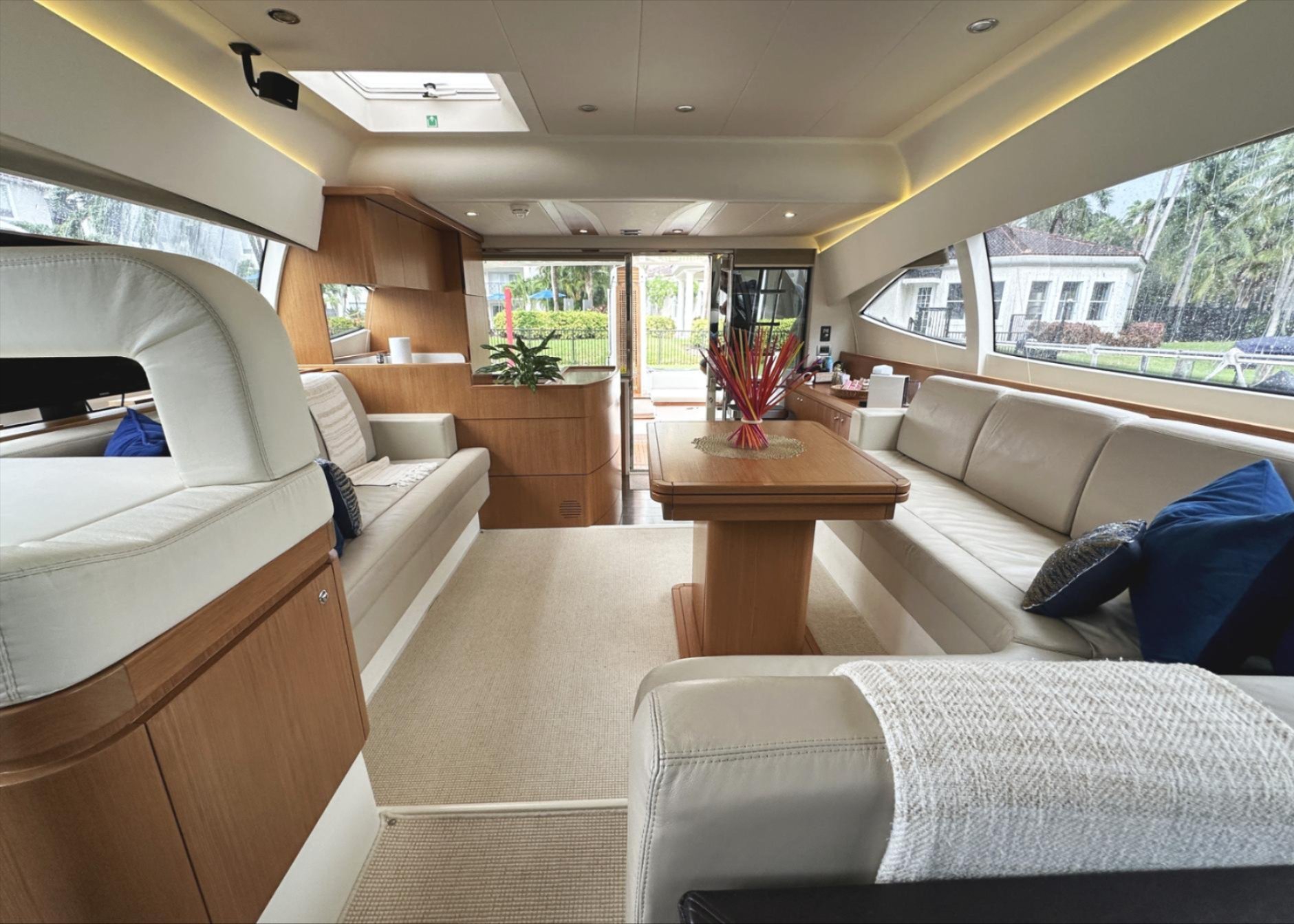 The flybridge of PRIMO is a standout feature offering a spacious area for outdoor entertainment and relaxation. It includes a helm station, a dining table, and comfortable seating, all within sturdy Bimini top and strataglass enclosure. The flybridge is also fitted with a wet bar and refrigerator making entertaining a breeze. The aft cockpit features an open bar to the galley, additional seating and dining space, and easy access to the swim platform for water activities.