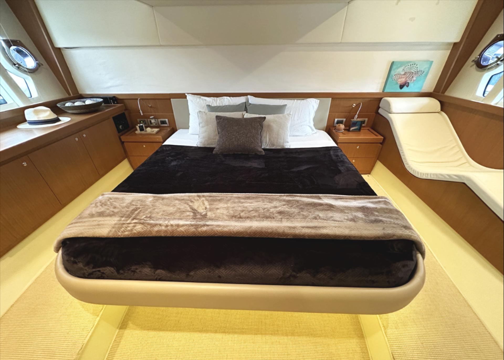 Inside, PRIMO boasts a modern, open-plan interior finished with high-quality materials. The salon features plush seating, a dining area, and a fully equipped up-galley. Panoramic windows offer stunning views and a bright, airy atmosphere. Below deck, the yacht accommodates up to six guests in three luxurious cabins, including a full-beam en-suite master with King berth, an en-suite VIP with centerline queen berth, and a guest cabin with side-by-side twin berths.