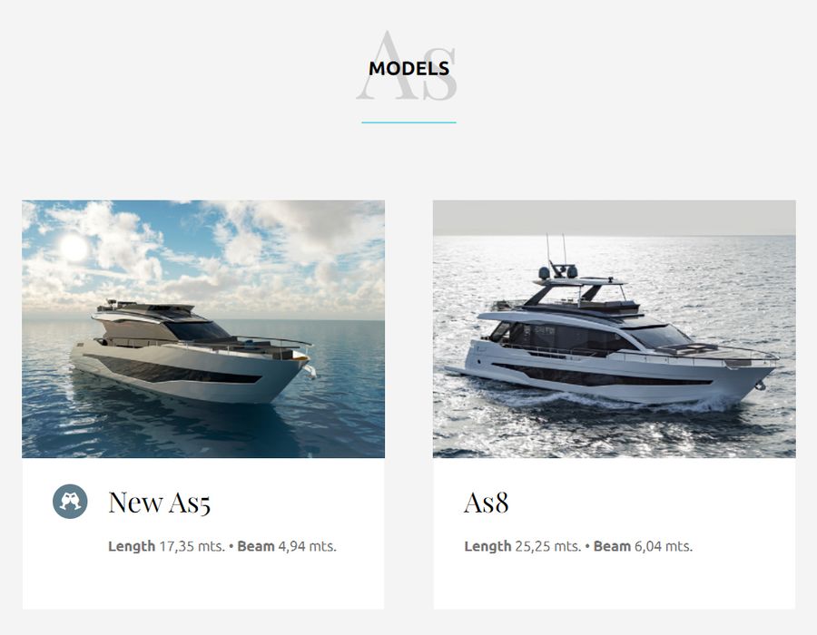 The As range responds to new trends and tastes in yachts up to 82 feet, with models such as As8 and As5. Luxury and sporty soul are combined in harmony in Astondoa’s As range, in which functionality has been prioritized without losing the elegance of a timeless design. Wide spaces full of light that go through its generous side windows are one of the main skills that give the As range a unique personality.