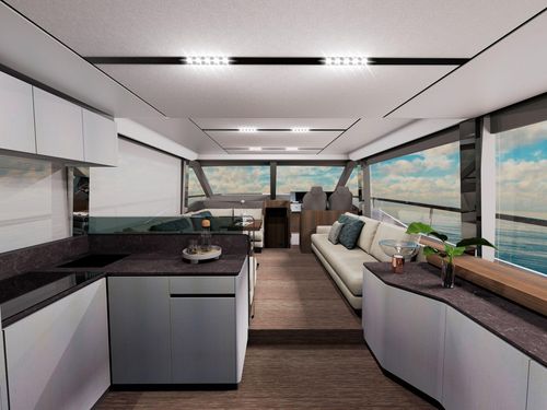 The walkaround main deck on the same level, follows the avant-garde concept of this range, configured as a large integrated space, in which the living room is connected to the kitchen and from which you can access the beach club and the bathtub through of the glass doors, which provides privacy between inside and outside; but if the doors are open, then facilitate access between both areas and the bow solarium.
