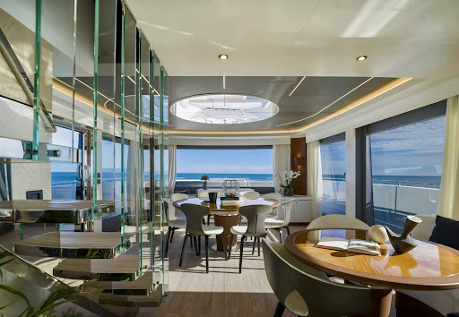 The interior boasts a blend of high-quality materials and reflective surfaces, especially evident in the main saloon, which seamlessly combines sophistication and warmth. It creates an inviting space that envelops guests in a luxurious and visually captivating ambiance.