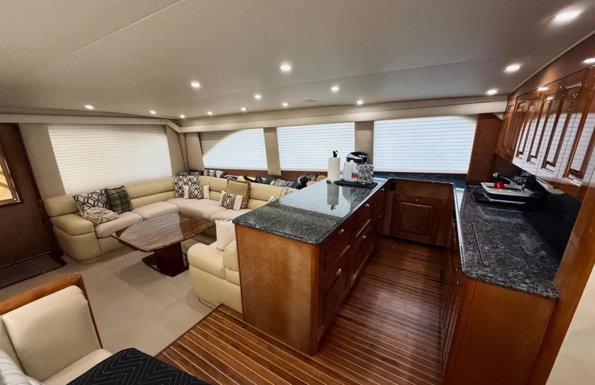Stepping aboard she displays a 179 square foot cockpit that includes Mezzanine seating with easy engine room access, ample storage, plenty of refrigeration/freezer space. A beautiful fighting chair sits center for its next catch. There are glendenning cable master stations on both starboard and port sides of the cockpit. The teak decks and cover boards have been replaced and all the varnish on the boat is in excellent condition. A custom painted Whisper Gray ladder leads to the flybridge where you will find updated Garmin electronics, a new Makrolon enclosure, and upgraded refrigeration/freezer chest forward of the console.