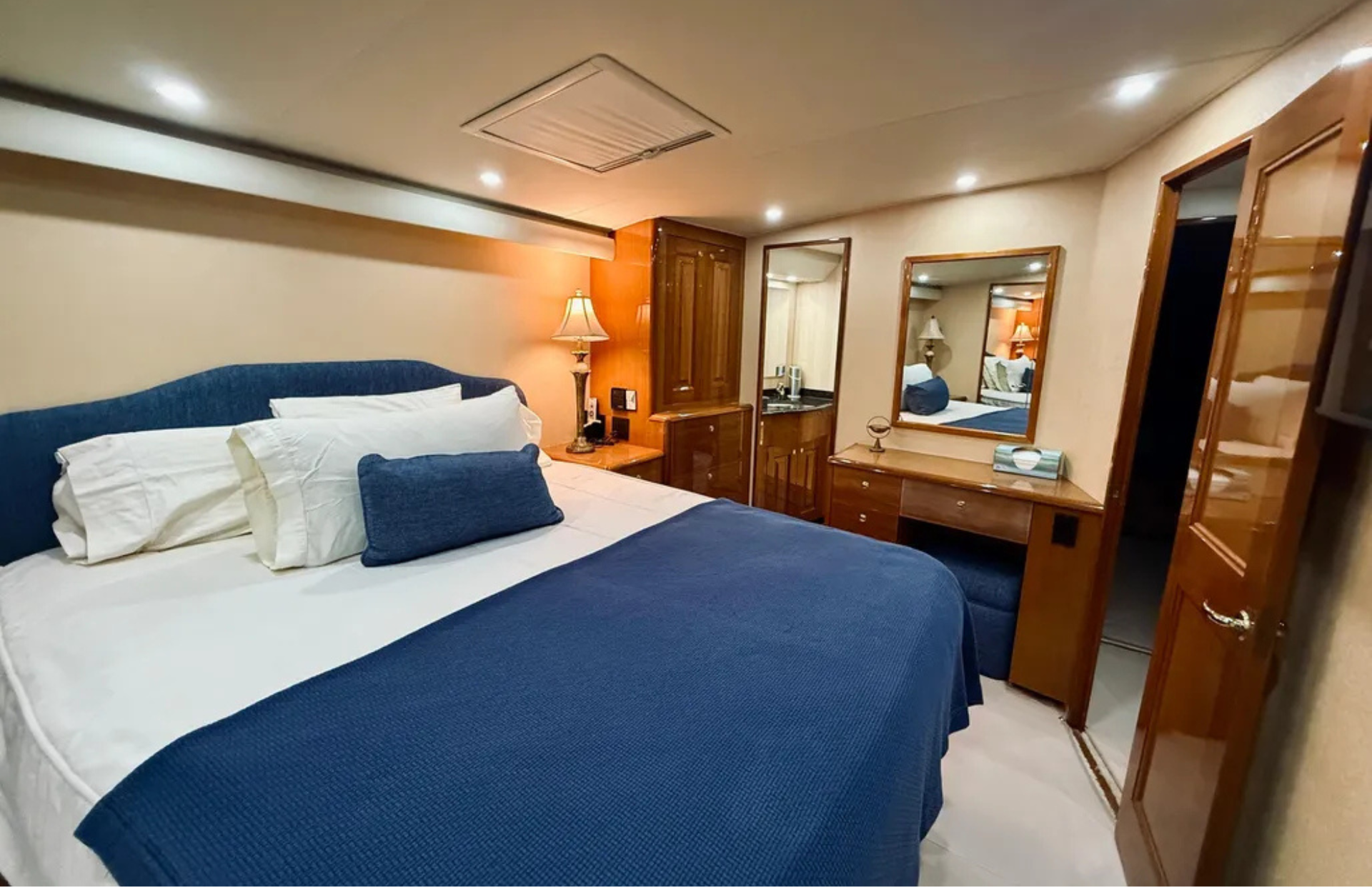 Below deck, the master suite with a walk around king size bed is amidship and the forward VIP stateroom has a centerline queen birth. A guest cabin on the starboard side has upper/lower berths, and the fourth stateroom, opposite of the companionway stackable washer and dryer, is abaft the master suite. It has a separate head and shower with direct engine room access, making this stateroom ideal for both guests or crew.