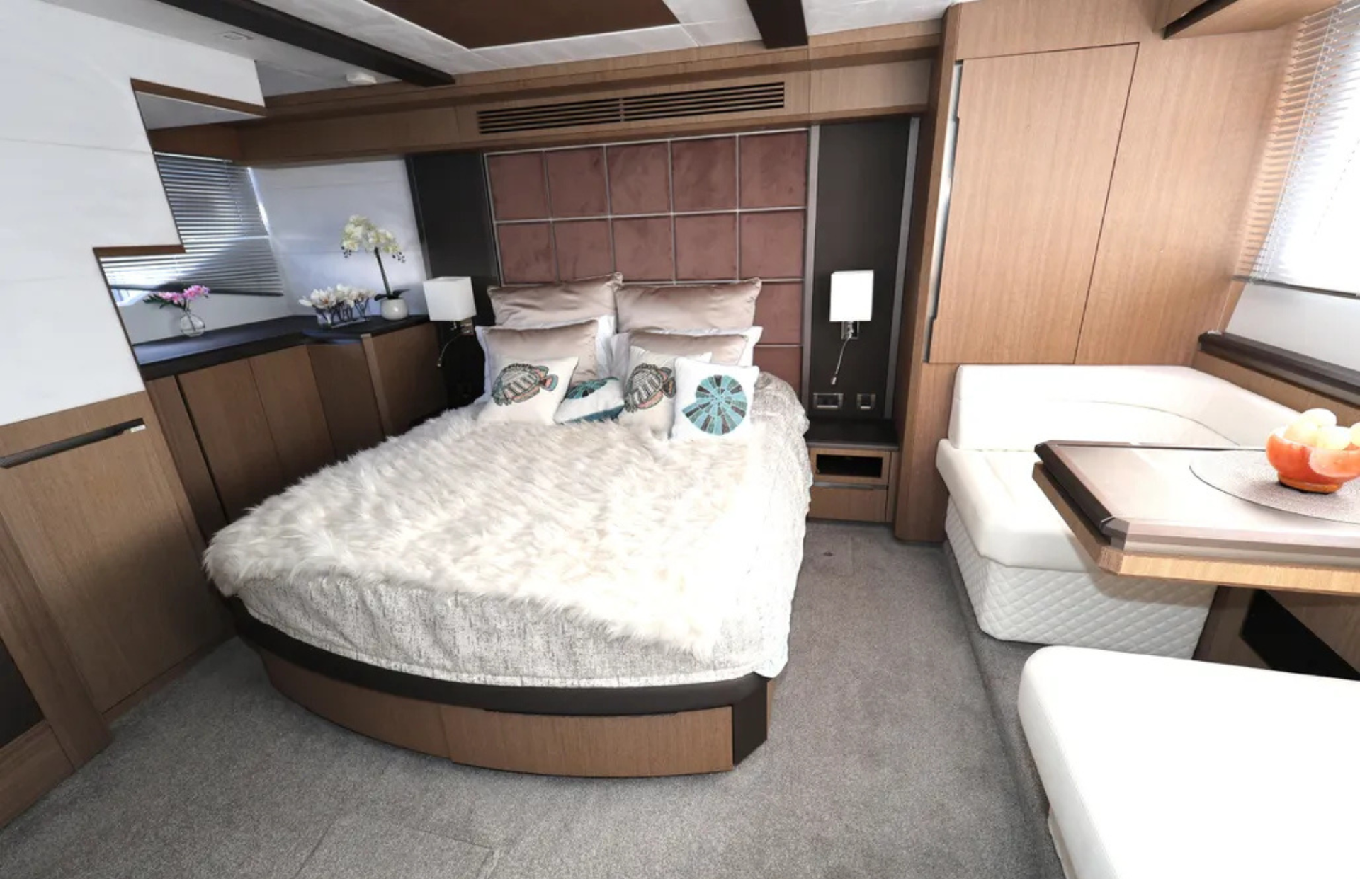 With the touch of a button the aft deck goes into “beach mode”. Sliding windows and aft doors bring the salon and the party outdoors. Scenic views abound through large sweeping windows throughout the salon, forward helm and gourmet galley. Luxurious accommodations await including two owner’s staterooms with plush centerline beds and en-suite heads. Choose your favorite, full beam centerline or forward centerline.
