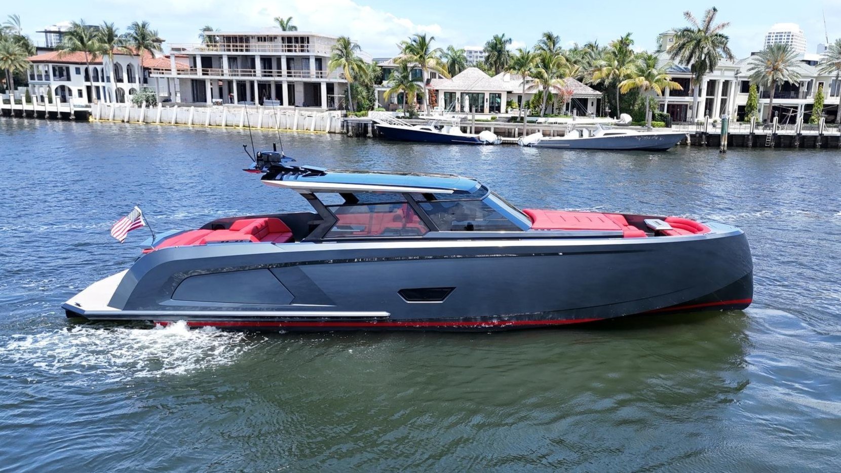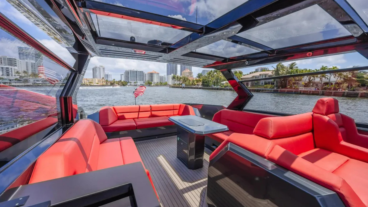 This fully loaded VQ58 features a sleek Lamborghini Silver aluminum hull w/ red soft goods, IPS drives for agile handling, and Sea keeper gyro stabilization for comfortable cruising. The expansive tender garage holds a custom VQ11 tender and two matching Seabobs.
