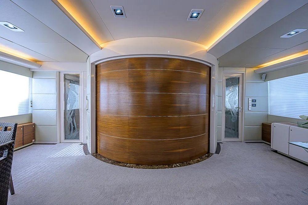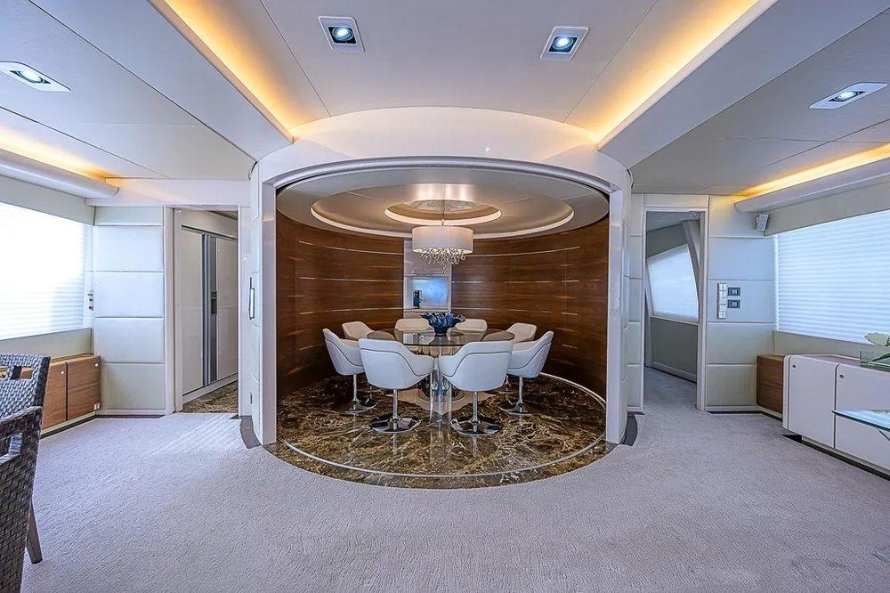 The formal dining area is midship forward of the salon and offers open or private formal dining experience with an oval transition wall. Retractable transition oval wall Dining table circulator glass Seating (8) Granite sole Wood accent treatments Cabinets with storage Espresso bar Chandelier Lighting LED Padded walls