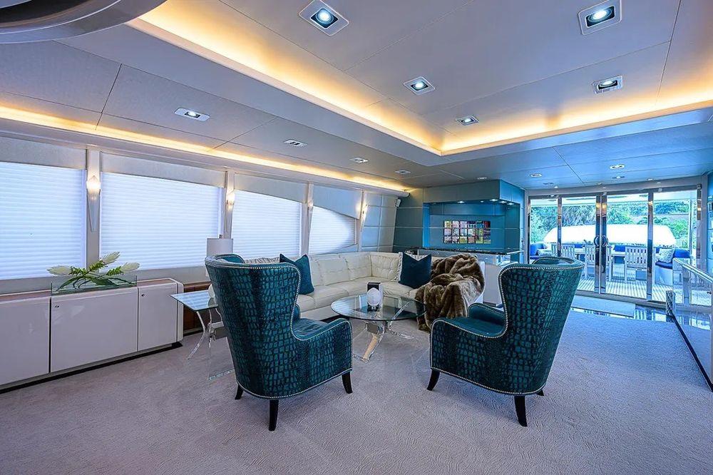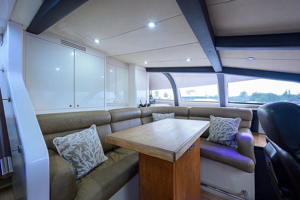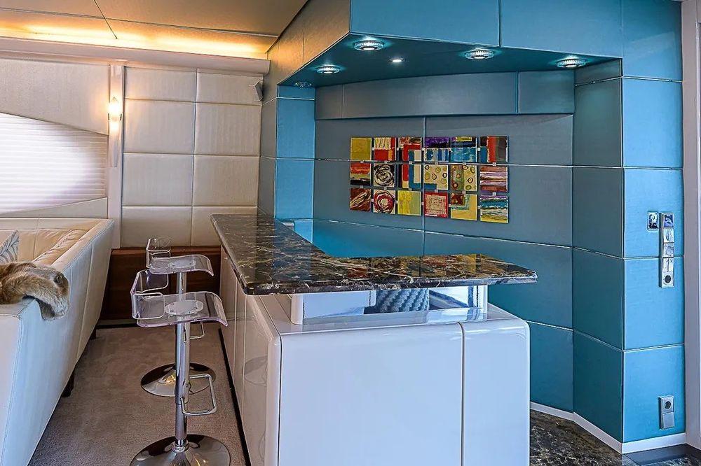 Entering the full beam salon from the aft deck through double sliding electric doors you are surprised by 7 1/2 foot high ceilings with oversized windows creating an open comfortable area to entertain guests and family to enjoy. To starboard, there is an L-shaped, fully equipped bar with stools. The informal table and chairs are to port. The settee is massive - a great spot for guests to comfortably enjoy. Granite landing Salon entrance electric door Full beam with oversized windows Easy chairs and coffee tables center lined Settee L shaped to starboard Blinds Carpet Companionway door etched seahorse Bar L-shaped with cabinets Granite countertop with sink Bar stools (2) Cabinets storage to port Refrigerator Ice maker Wine cooler Television 50 Smart LED DirecTV HD control box Sony Blu-Ray disc player Bose lifestyle system with (3) zones (main salon, aft deck, flybridge) Bose amplifier Bose stereo speakers iPod auxiliary input Lighting LED