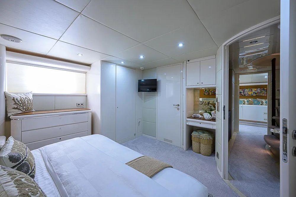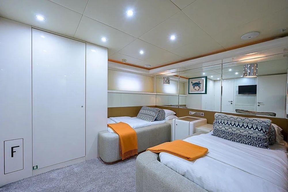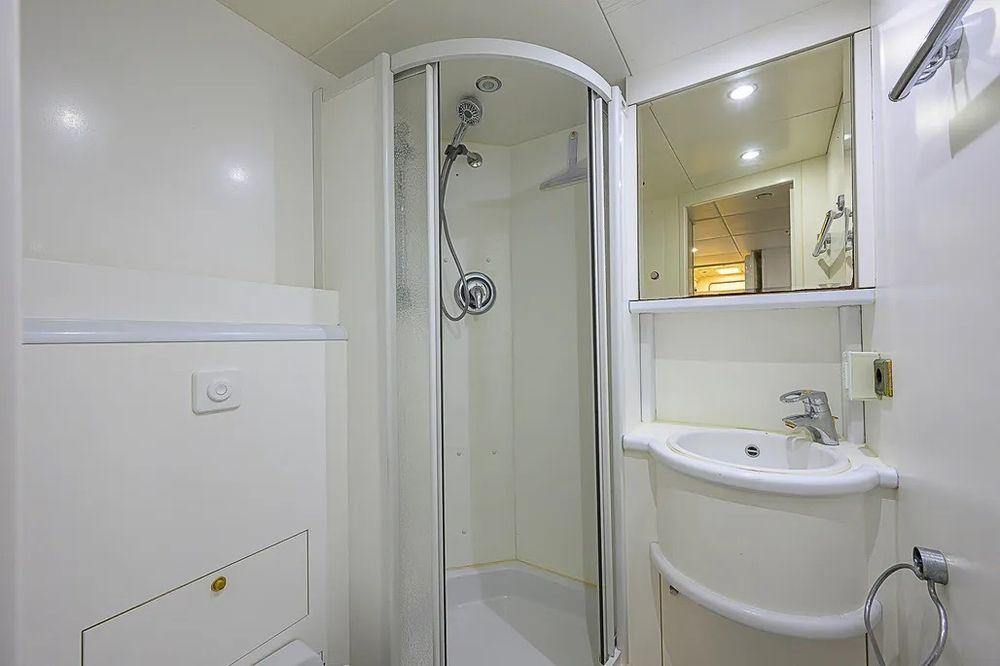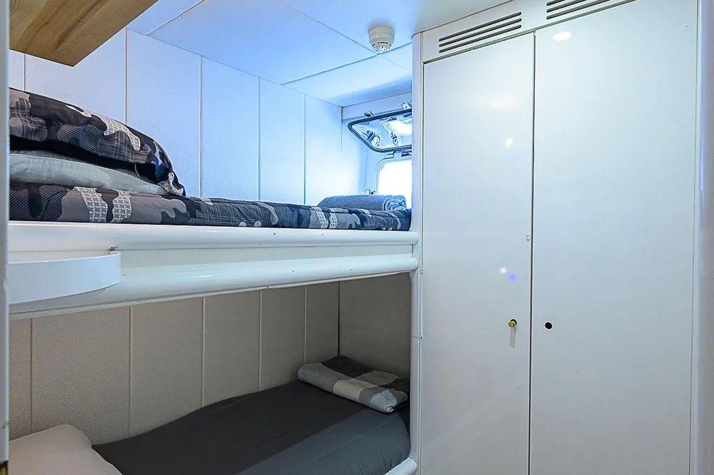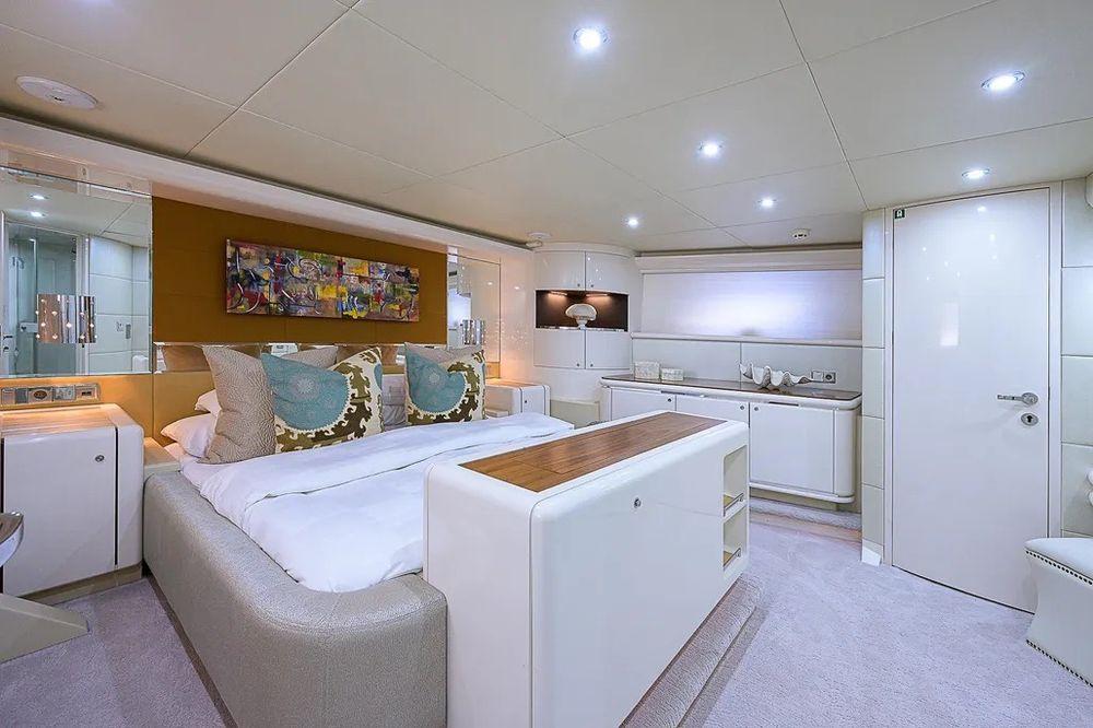 CABINS Accommodations for 2 Owners and 6 Guests. As you enter from the aft deck through double sliding electric doors there is the spacious salon with formal dining area. The galley is to port with the companion access to starboard. The companionway provides day head access, guest stateroom access, with on-deck master forward. The guest staterooms are accessed midship with a stairway. The guest stateroom configurations are 2 queen berths and 1 double berth, all en-suite and beautifully appointed. Crew quarters are separate with private access from the aft deck with 3 staterooms and 3 heads. Crew configuration is 1 double and 2 stacked bunk rooms with 3 heads, crew mess with dining area. Engine room access is through a water tight door in the crew quarters.