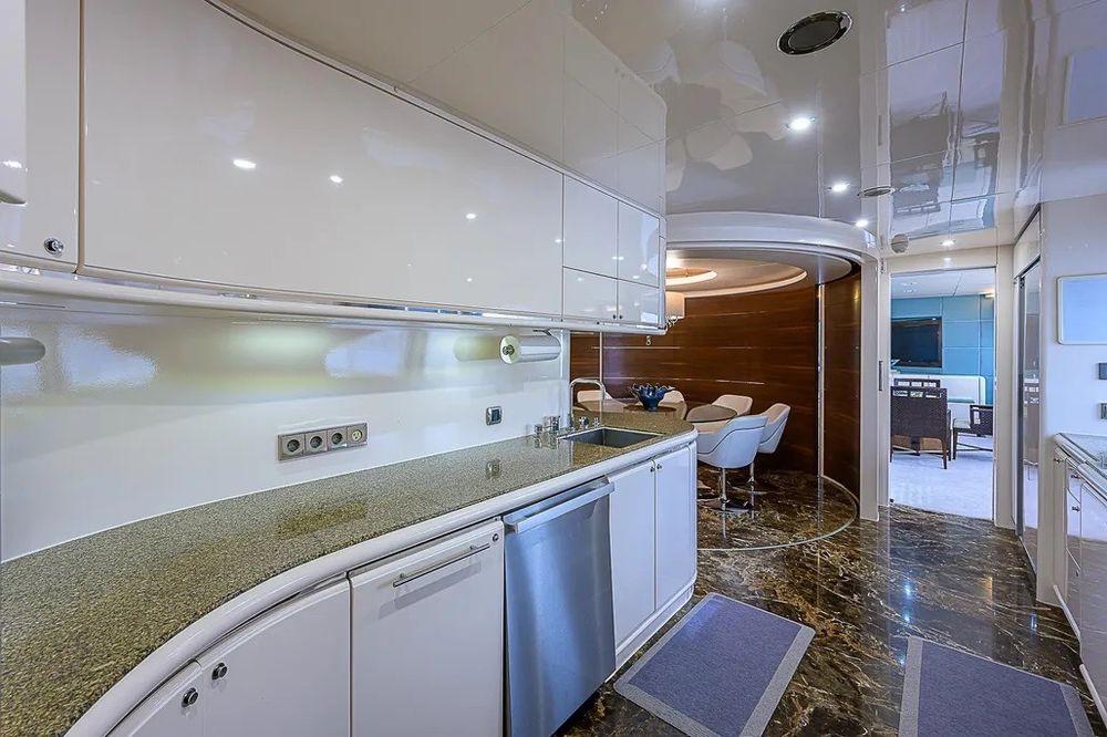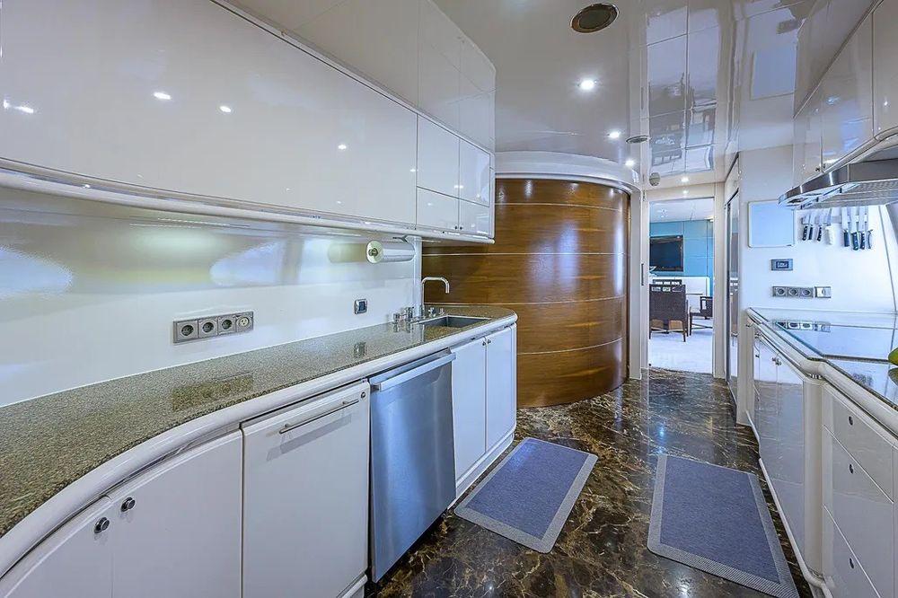 The Galley is open to the salon and formal dining room with ample storage, modern gourmet appliances, large window for natural lighting and forward deck access through watertight door. Etched glass door Granite sole Granite countertops Sink flush mounted Cabinets Pantry open Refrigerator Sub Zero Cooktop Miele Hood lighted with fan Miele Oven over under Miele Microwave Miele Dishwasher Miele Outlets 110V GFI Lighting LED Watertight door Sea light