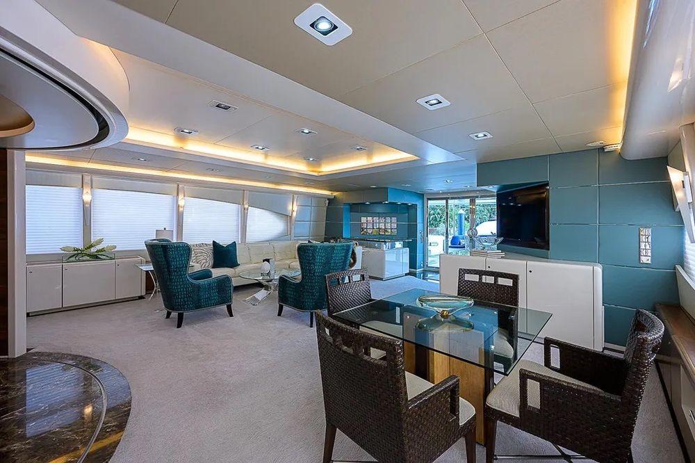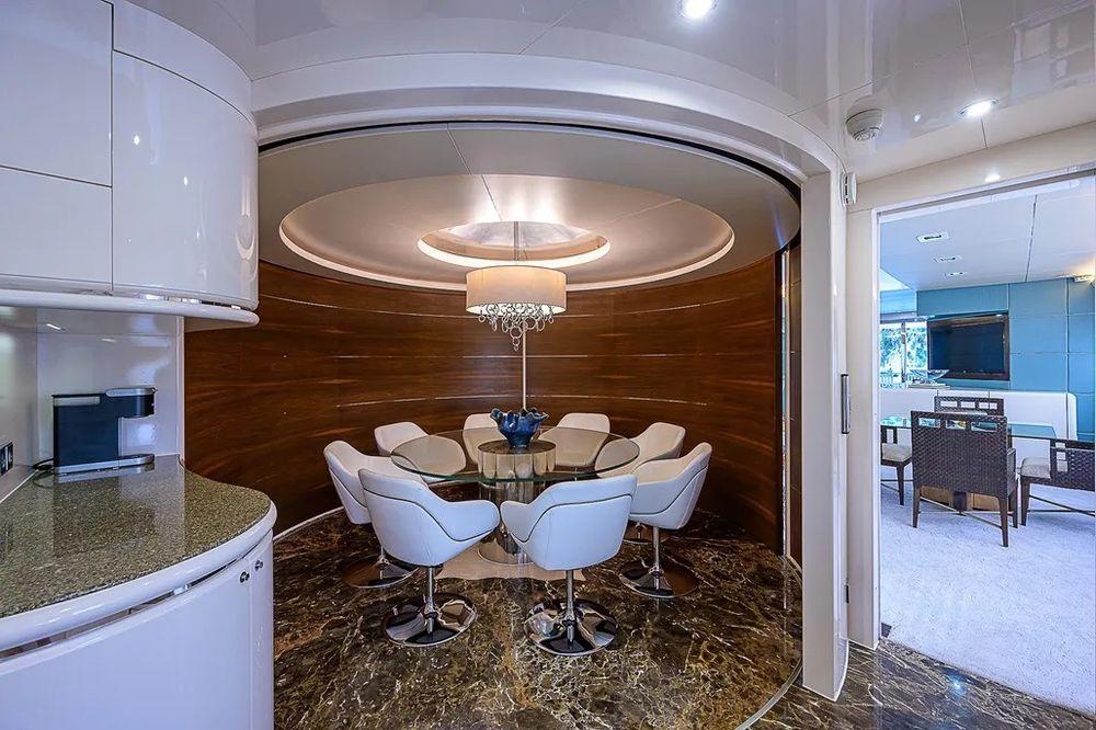 The formal dining area is midship forward of the salon and offers open or private formal dining experience with an oval transition wall. Retractable transition oval wall Dining table circulator glass Seating (8) Granite sole Wood accent treatments Cabinets with storage Espresso bar Chandelier Lighting LED Padded walls
