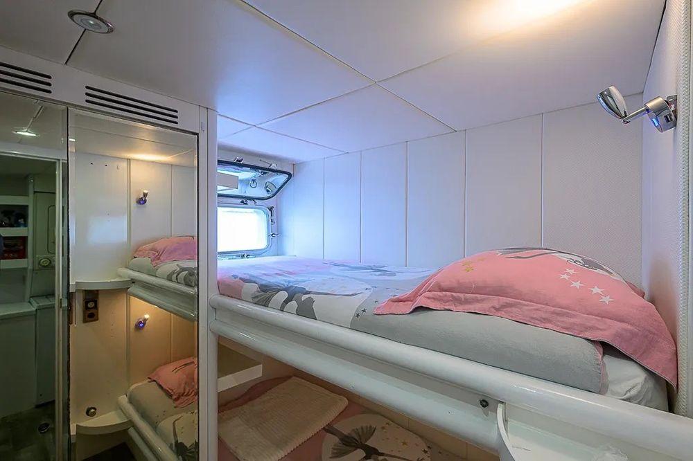 CABINS Accommodations for 2 Owners and 6 Guests. As you enter from the aft deck through double sliding electric doors there is the spacious salon with formal dining area. The galley is to port with the companion access to starboard. The companionway provides day head access, guest stateroom access, with on-deck master forward. The guest staterooms are accessed midship with a stairway. The guest stateroom configurations are 2 queen berths and 1 double berth, all en-suite and beautifully appointed. Crew quarters are separate with private access from the aft deck with 3 staterooms and 3 heads. Crew configuration is 1 double and 2 stacked bunk rooms with 3 heads, crew mess with dining area. Engine room access is through a water tight door in the crew quarters.