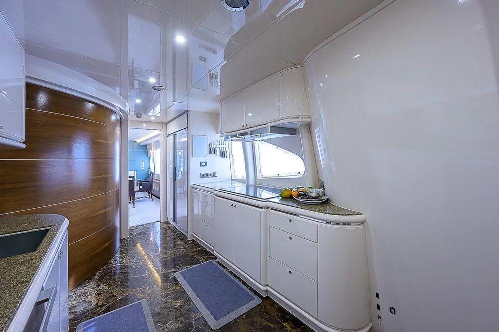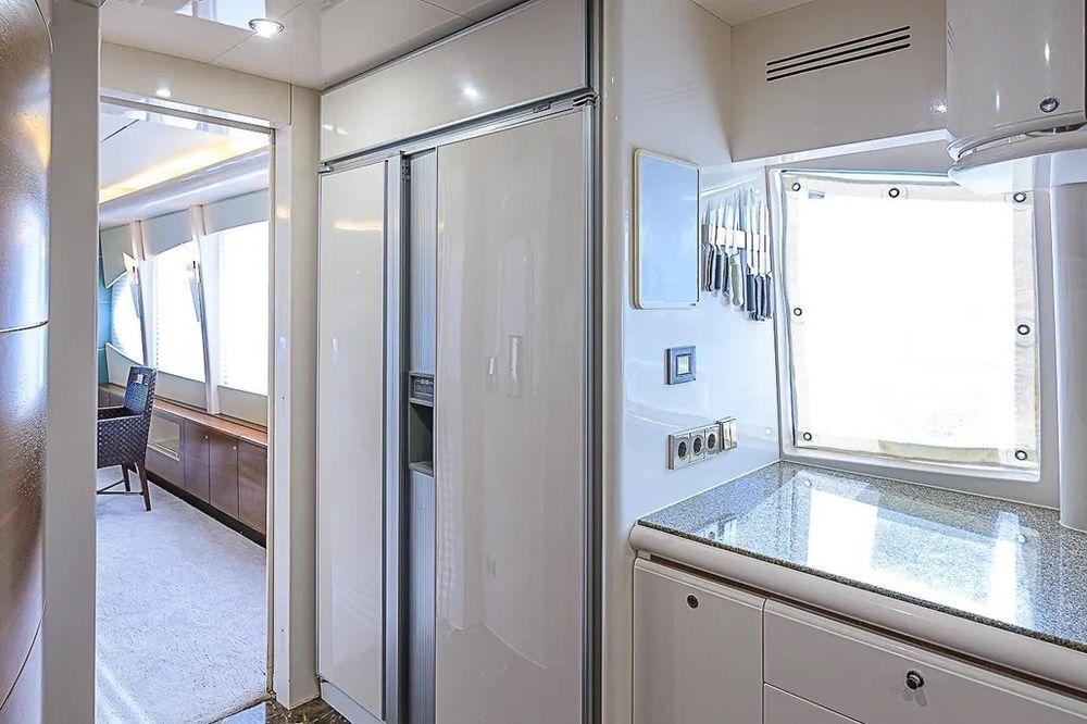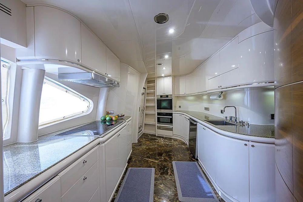 The Galley is open to the salon and formal dining room with ample storage, modern gourmet appliances, large window for natural lighting and forward deck access through watertight door. Etched glass door Granite sole Granite countertops Sink flush mounted Cabinets Pantry open Refrigerator Sub Zero Cooktop Miele Hood lighted with fan Miele Oven over under Miele Microwave Miele Dishwasher Miele Outlets 110V GFI Lighting LED Watertight door Sea light