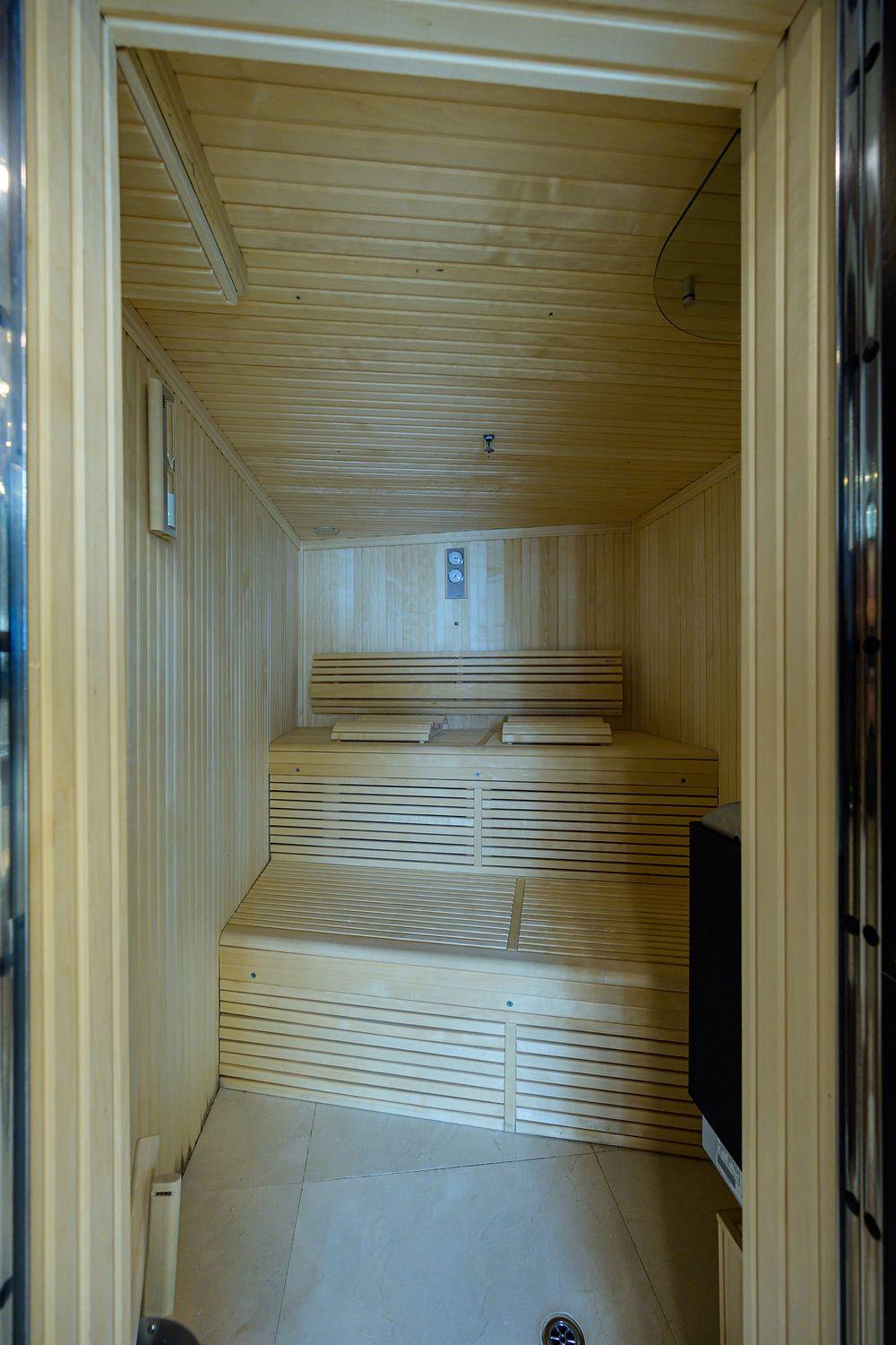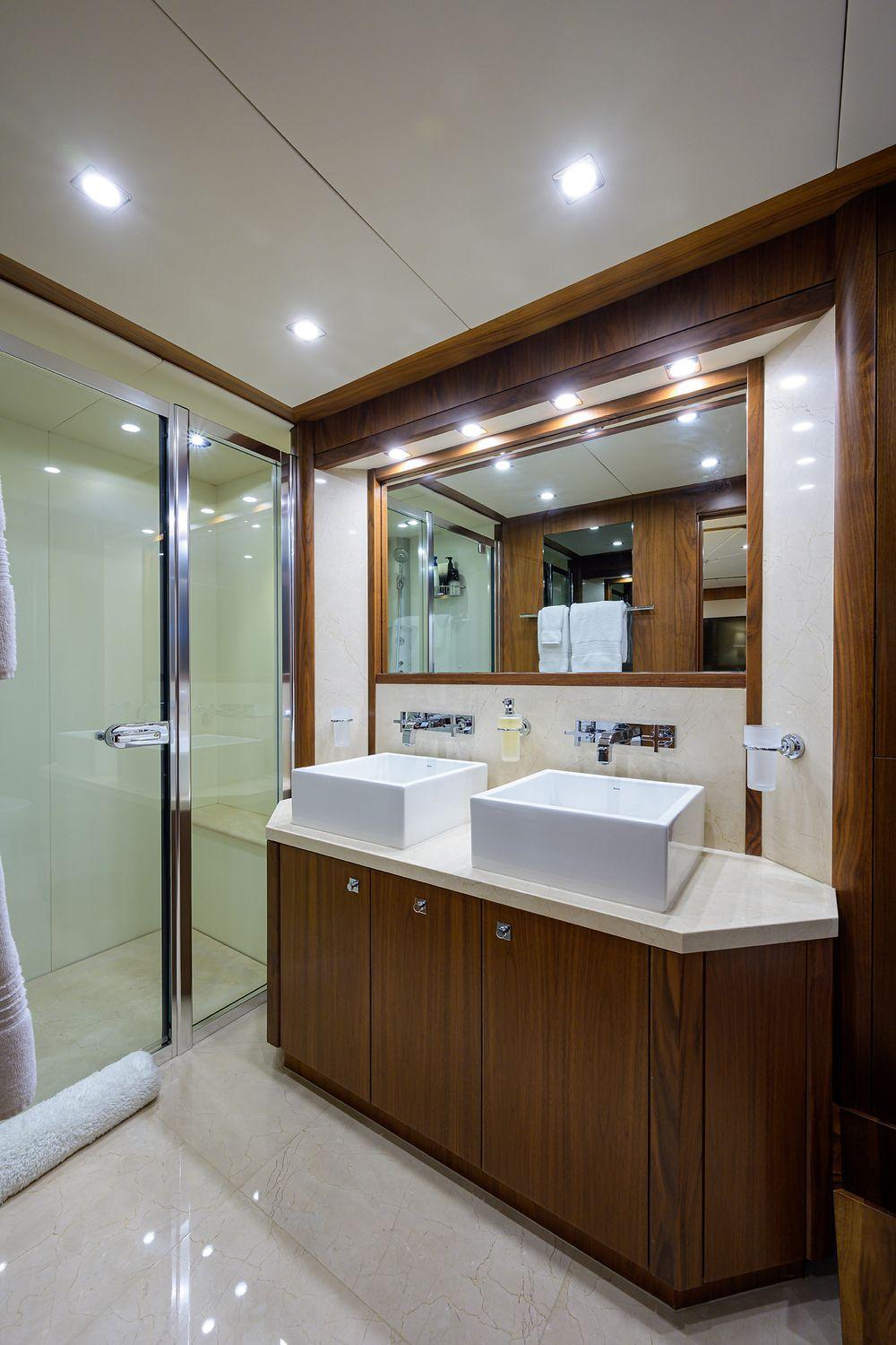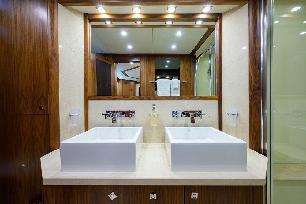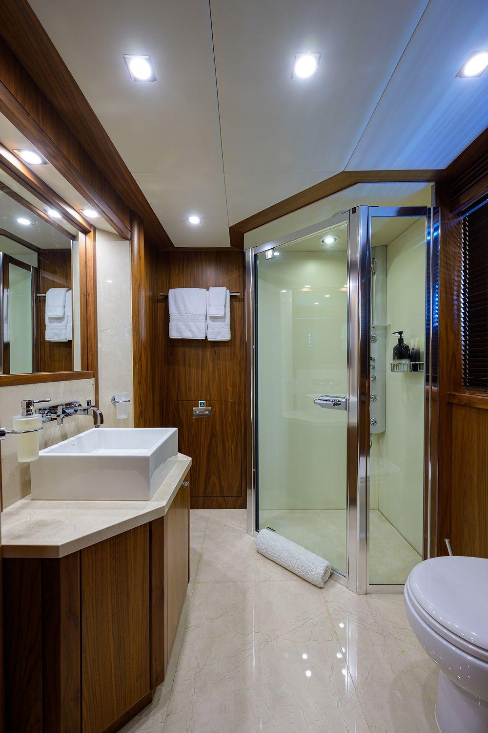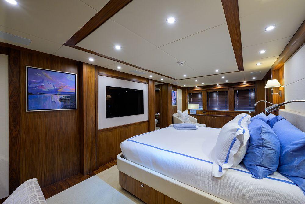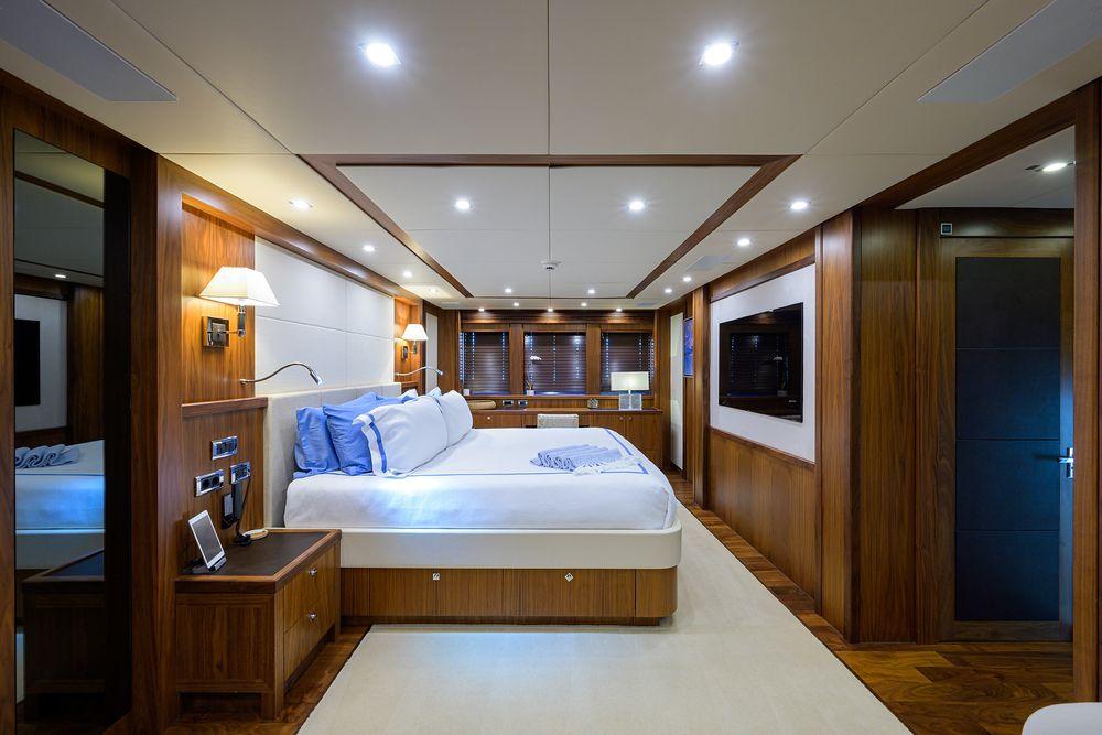 Entering the Owner's suite forward of the main deck the doorway is positioned starboard side which leads into a full beam Owner’s cabin with king size bed, both port and starboard windows have wooden blinds to shelter from the light and for privacy. The interior is calming in décor with ample space. Going forward port side is the walk-in closet with a WC to the starboard side. The bathroom is accessed down 2 steps which are central to the cabin with a large steam shower to starboard and sauna to port. Twin washbasins sit centrally with ample cupboard space below. The Owner's cabin feels as large as many of the larger yachts, this is a comment often made by those who view.