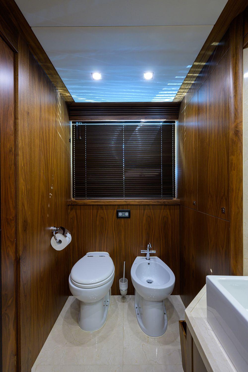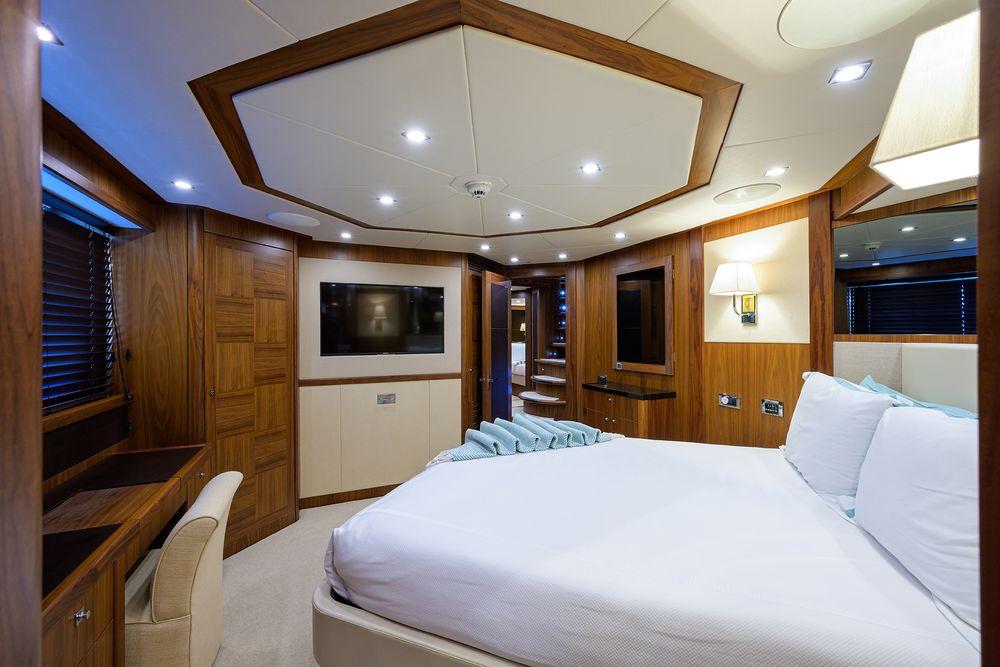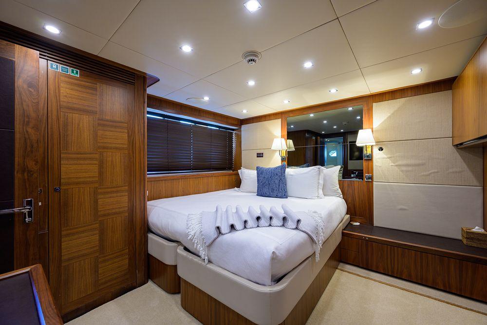 Entering the Owner's suite forward of the main deck the doorway is positioned starboard side which leads into a full beam Owner’s cabin with king size bed, both port and starboard windows have wooden blinds to shelter from the light and for privacy. The interior is calming in décor with ample space. Going forward port side is the walk-in closet with a WC to the starboard side. The bathroom is accessed down 2 steps which are central to the cabin with a large steam shower to starboard and sauna to port. Twin washbasins sit centrally with ample cupboard space below. The Owner's cabin feels as large as many of the larger yachts, this is a comment often made by those who view.