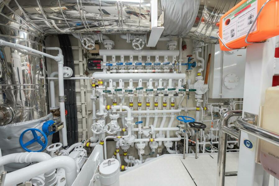 This is not “high hours”; this is proven hours backed by one of the most exhaustive mechanical interventions in the vessel’s life—building on the 2016 refit, during which both generators were replaced, the extensive 2021 works, and the most recent 11-month, €3.2M refit period that completed the full 15-Year Class Survey and renewed every major mechanical, structural, electrical, and tank system onboard. As part of this program, we also removed the tender cradle and reconfigured the aft lower-deck arrangement, adding an additional cabin for crew or supernumeraries and transforming the area into a dedicated aquatic water sports center and mini beach club. And let’s not forget the new sundeck Jacuzzi. Here are some, but not all, of the items addressed in this most recent refit.