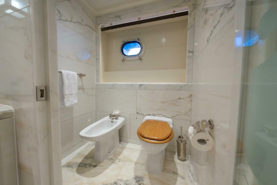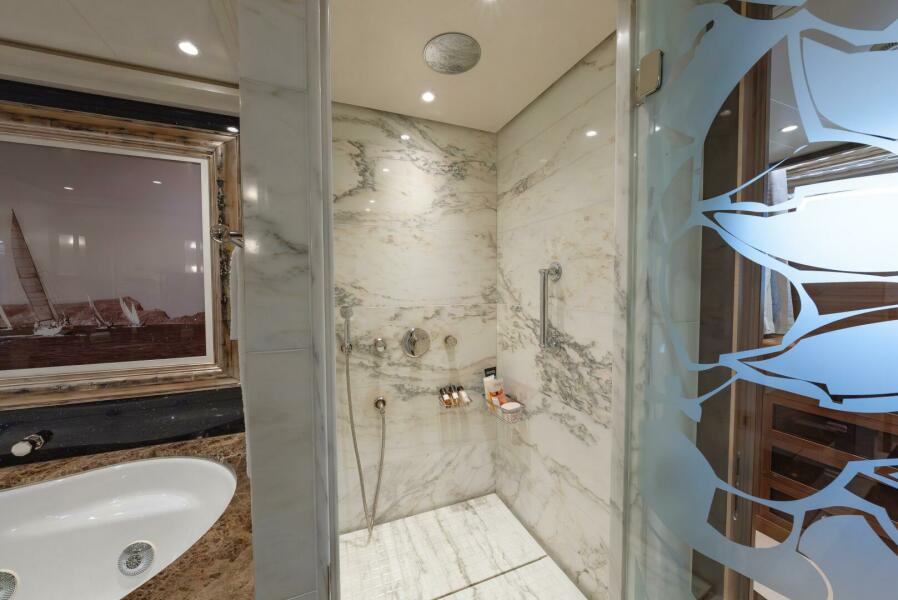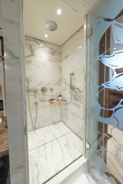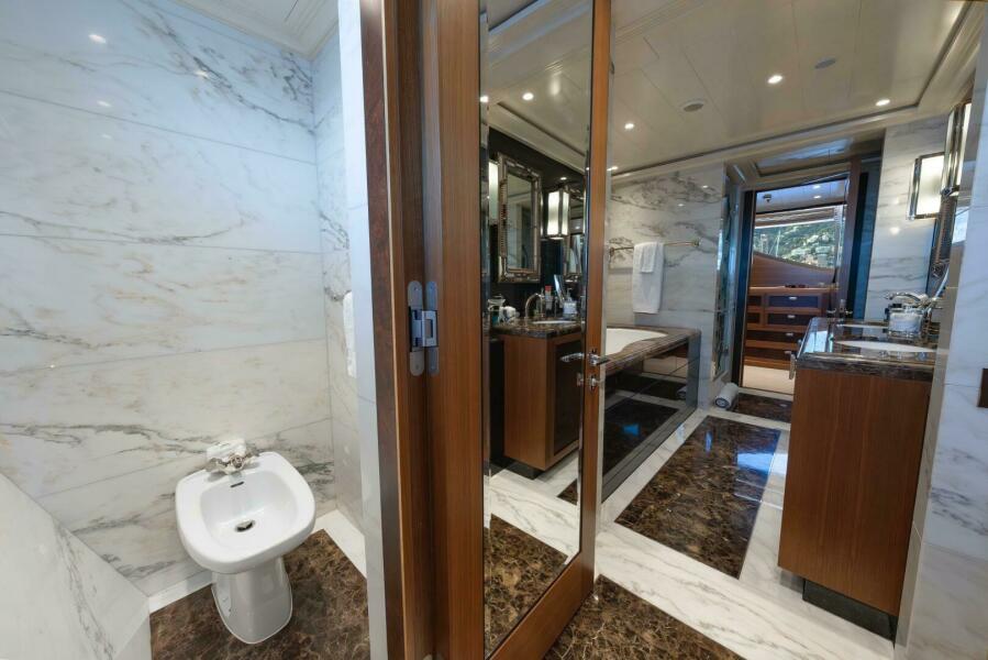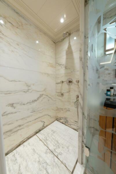 Experienced yacht owners consistently ask for well-placed day heads, and LATITUDE exceeds expectations with three. The bridge-deck day head is thoughtfully executed, carrying the same materials, textures, and detailing as the surrounding foyer, so it reads as a deliberate part of the design. It feels cohesive, refined, and fully integrated, rather than a utilitarian afterthought.