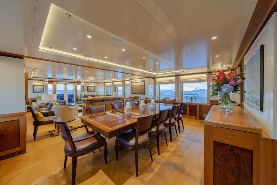 The bar is topped with solid varnished teak and fully equipped with a fridge, sink, dumbwaiter, and generous storage. A substantial counter aft of the bar serves beautifully for buffet service and could easily accommodate a permanent grill. Further aft, the custom 4 m RHIB rescue tender sits on its cradle; its crane can cleverly double as a buffet table when stowed.