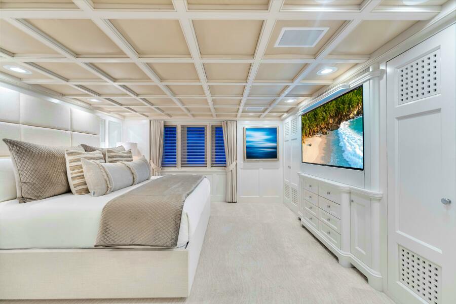 STAR DIAMOND accommodates 10 guests in ultimate comfort across five luxuriously appointed staterooms. The full-beam master stateroom on the main deck offers unparalleled privacy. The owner’s lounge, located on the starboard side, includes seating, an entertainment center, and a desk. The sleeping area on the port side features a plush king-size bed, and the master suite is completed with a luxurious en-suite bath, featuring both a shower and a Jacuzzi tub. The additional guest staterooms provide versatility, with two double-bed staterooms and two convertible twin beds, ensuring ample space for all.