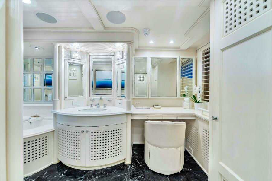 The aft port guest stateroom is configured with two twin beds that, when stored, allow the stateroom to transform into a sitting room or the suite side of a full-beam guest suite when combined with the aft starboard queen stateroom. This port-side "suite" includes a marble bathroom with a bathtub and shower, and the twin beds can be converted into a king bed.