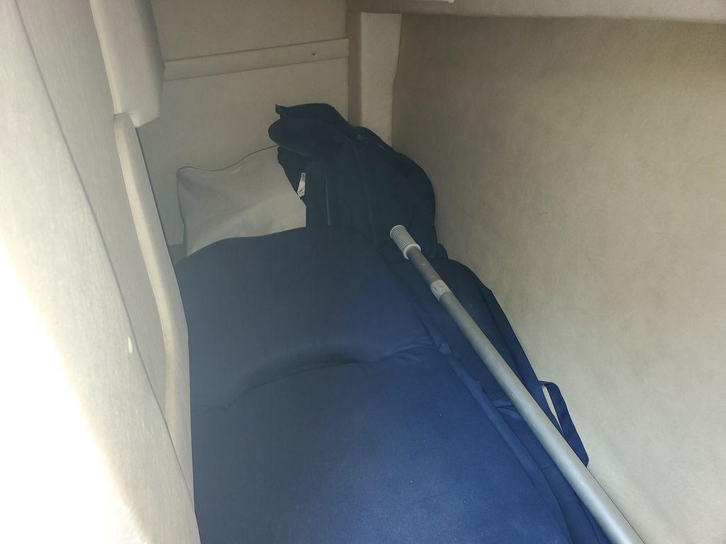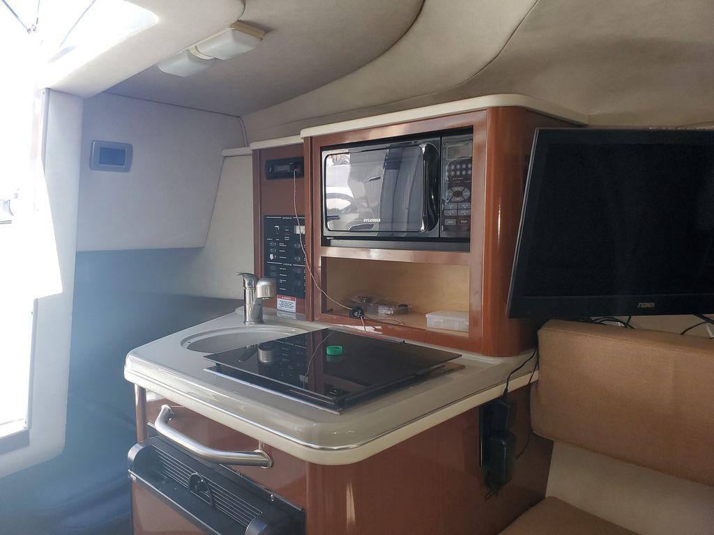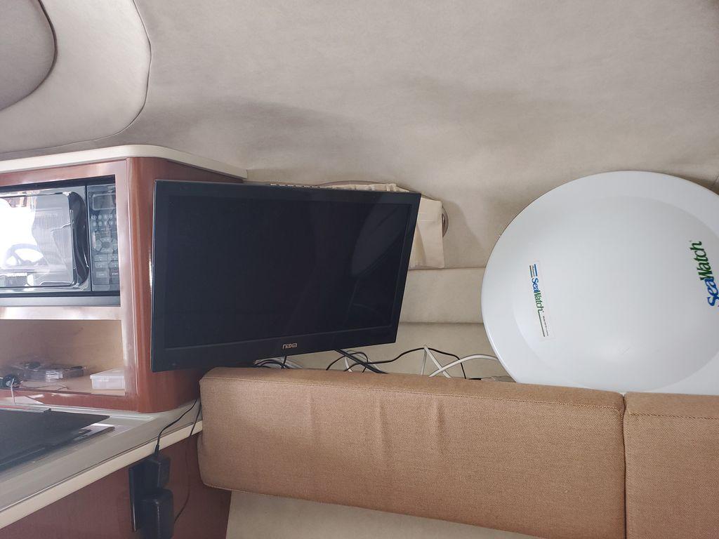 Included is a full camper enclosure (spare enclosure is included), Cockpit cover, shore power hook up, air conditioning, AC/DC refrigerator, microwave, water heater with 20 gallon fresh water tank, butane stovetop, battery charger, Sony marine stereo, flat screen TV, remote control spot light, VHF radio, and GPS.