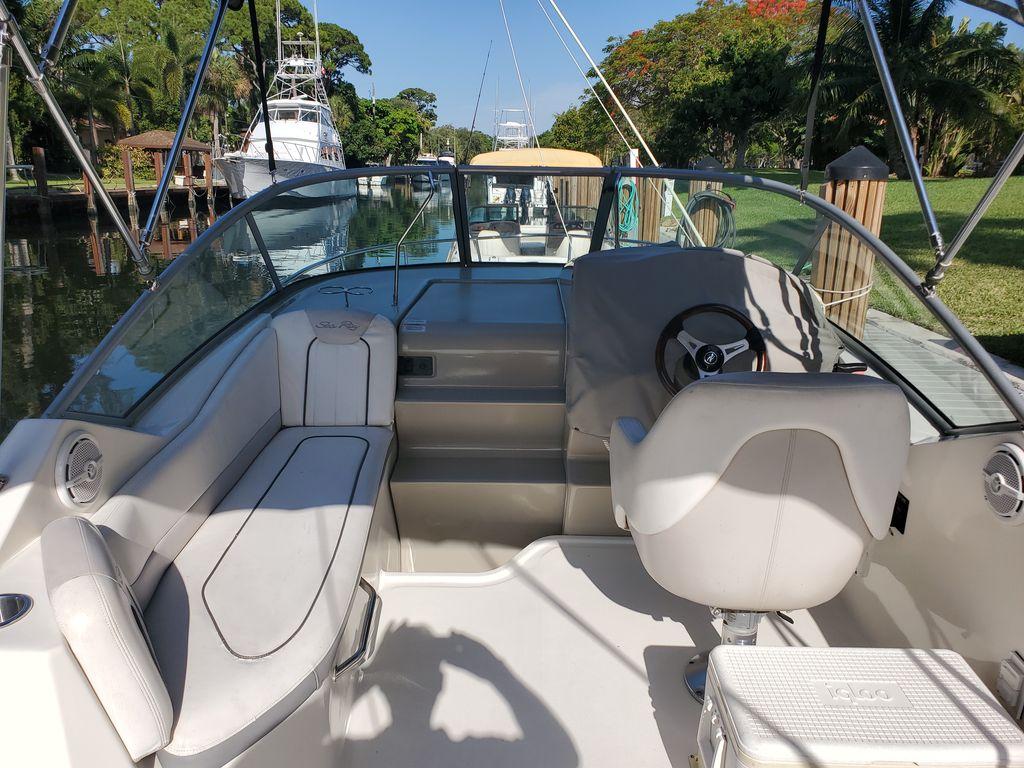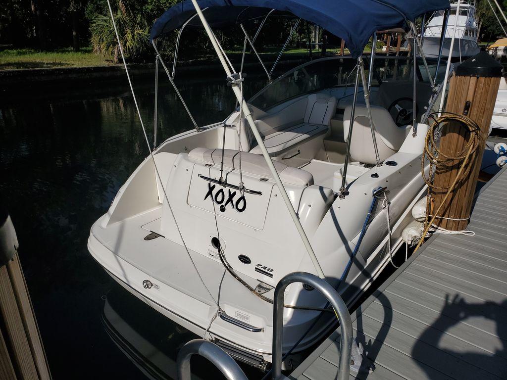 The 240 Sundancer is a grand step into Sea Ray's world-renowned family of raised helm, mid-cabin stateroom designed cruisers. The ingenious cabin layout encompasses plentiful storage, gorgeous cherry wood cabinetry and four color-coordinated fabric design package choices. Outside, the functional cockpit is designed for versatility and entertainment for fun while docked or underway. At first glace she may appear as a large-scale cruiser, but she's still trailerable with an 8' 6" beam.