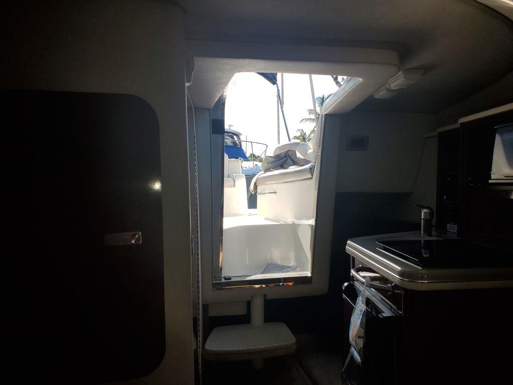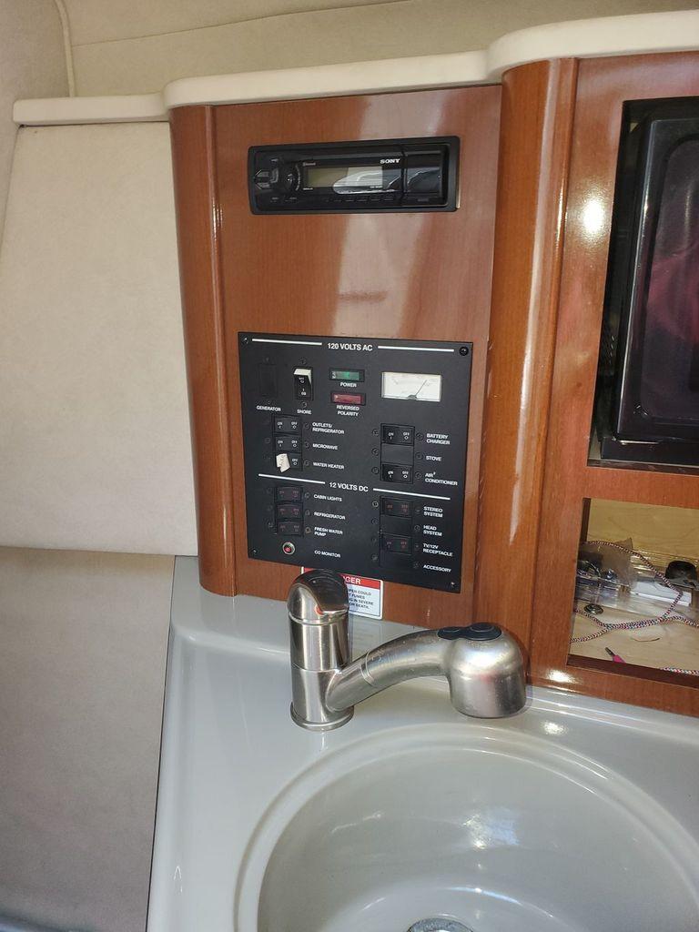 Included is a full camper enclosure (spare enclosure is included), Cockpit cover, shore power hook up, air conditioning, AC/DC refrigerator, microwave, water heater with 20 gallon fresh water tank, butane stovetop, battery charger, Sony marine stereo, flat screen TV, remote control spot light, VHF radio, and GPS.