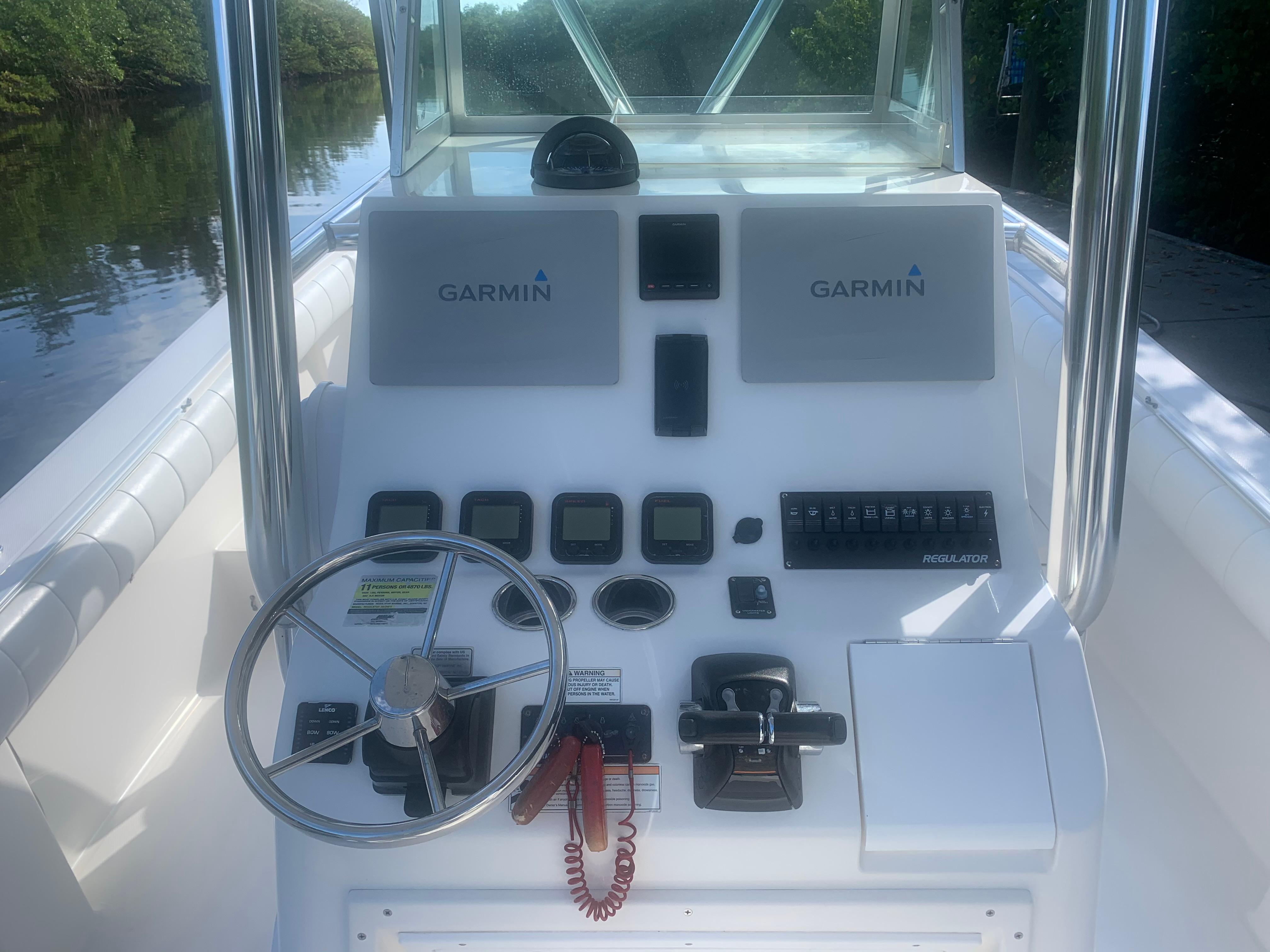 The original flagship of Regulator Marine, the 26 FS delivers aggressive performance, maneuverability and the legendary soft, dry ride for which Regulator is famous, thanks to its sharp bow entry and 24-degree deadrise. Regulator's exclusive Fiberglass Grillage System provides the strength and structural integrity that enables it to withstand the most challenging bluewater swells.The 26' is loaded with standards like a 64-quart console cooler under the forward seat; an all-fiberglass, stand-up head compartment with portable marine toilet; and pop-up cleats and bow lights. The optional SuperSport leaning post accommodates up to nine rods and features an integrated tackle storage system, built-in footrest and backrest. Other attractive options include a practical fiberglass T-Top with built-in 16-foot Lee Sidewinder outrigger bases, two 17-quart bait boxes, 20-gallon livewell in the transom and a vast 700-quart, in-deck wet/dry box that doubles as locking rod storage. The twin 250-hp Yamaha four-stroke engines deliver the speed and fuel economy to take you wherever you want to go.