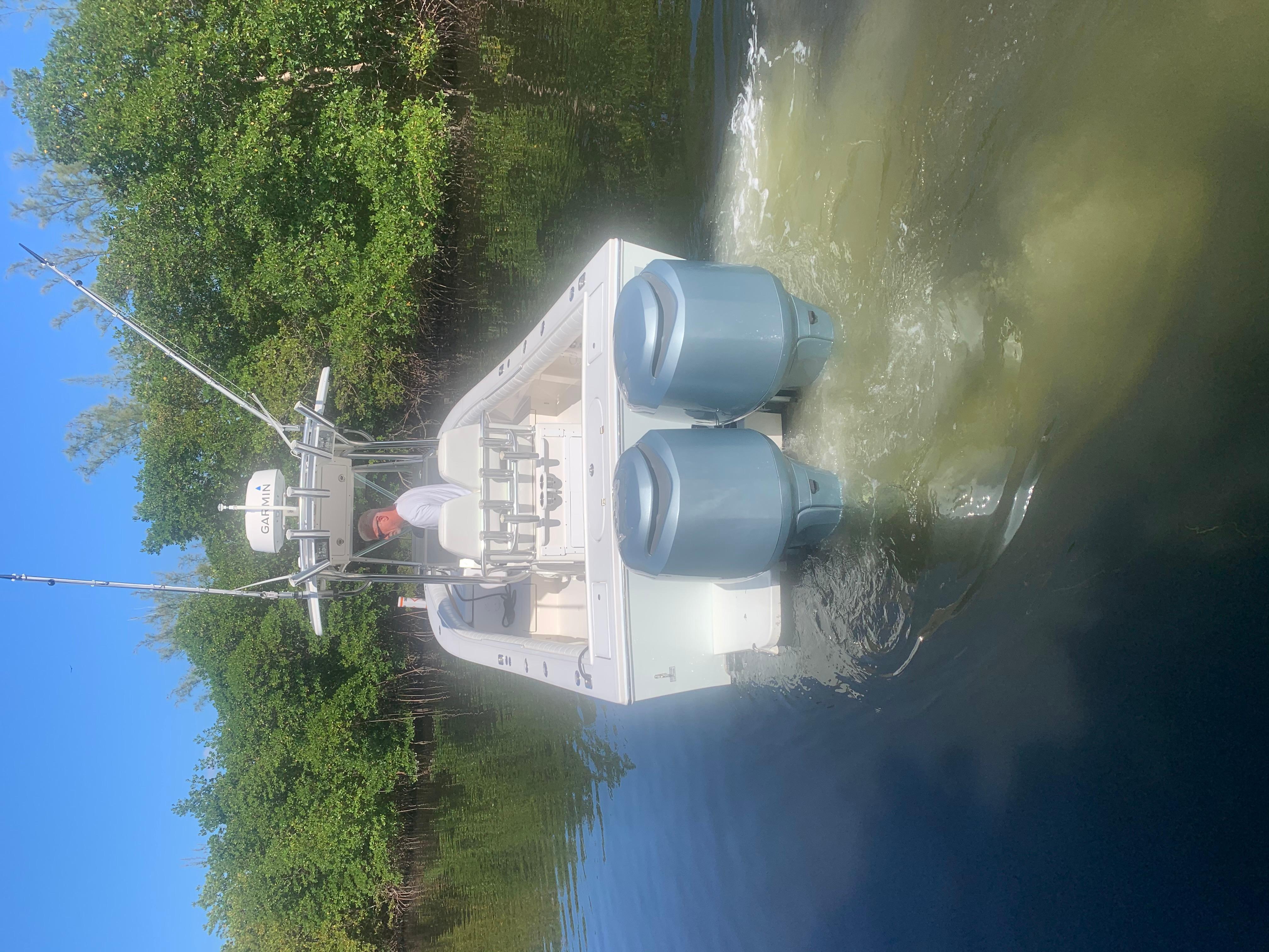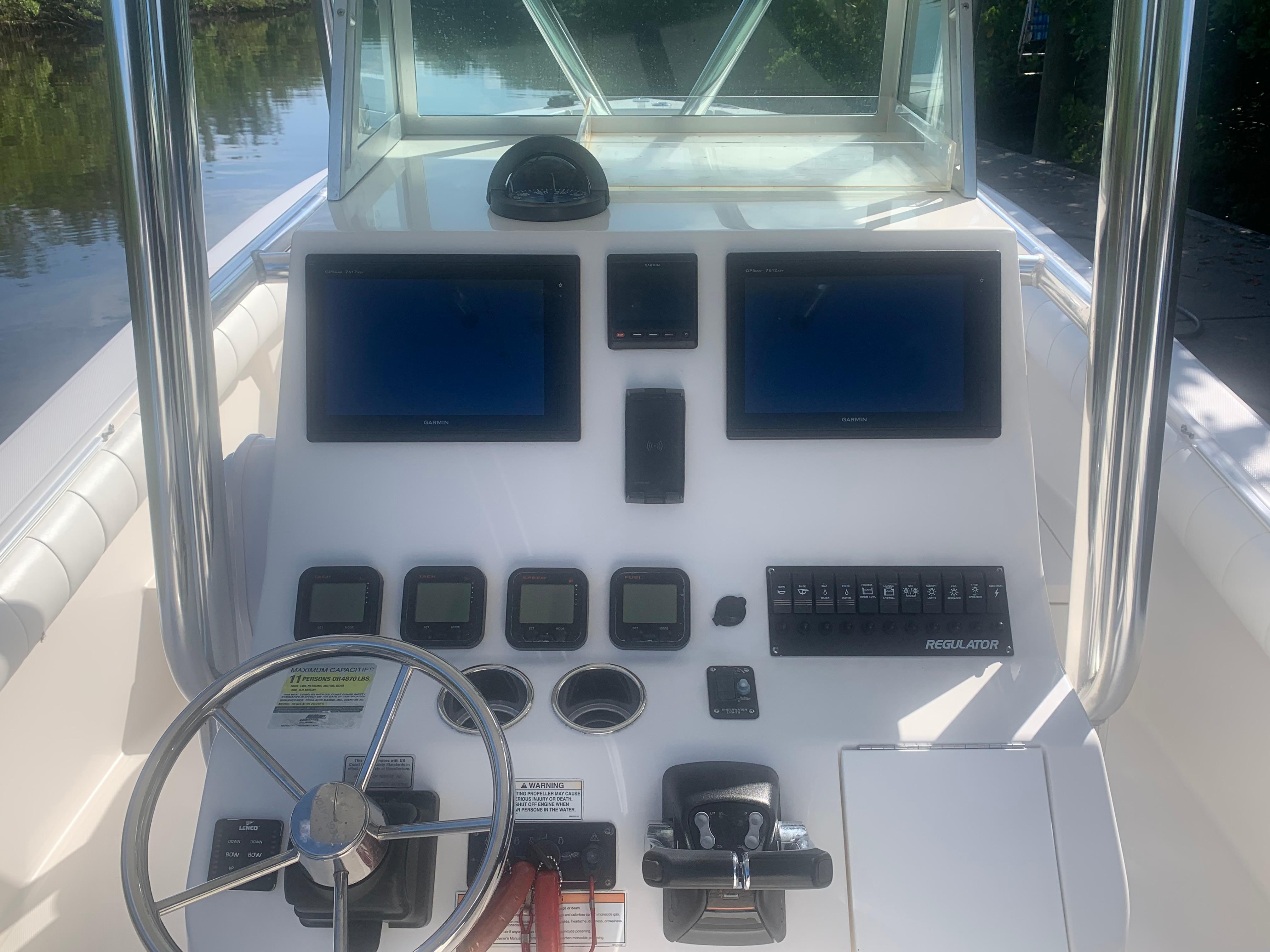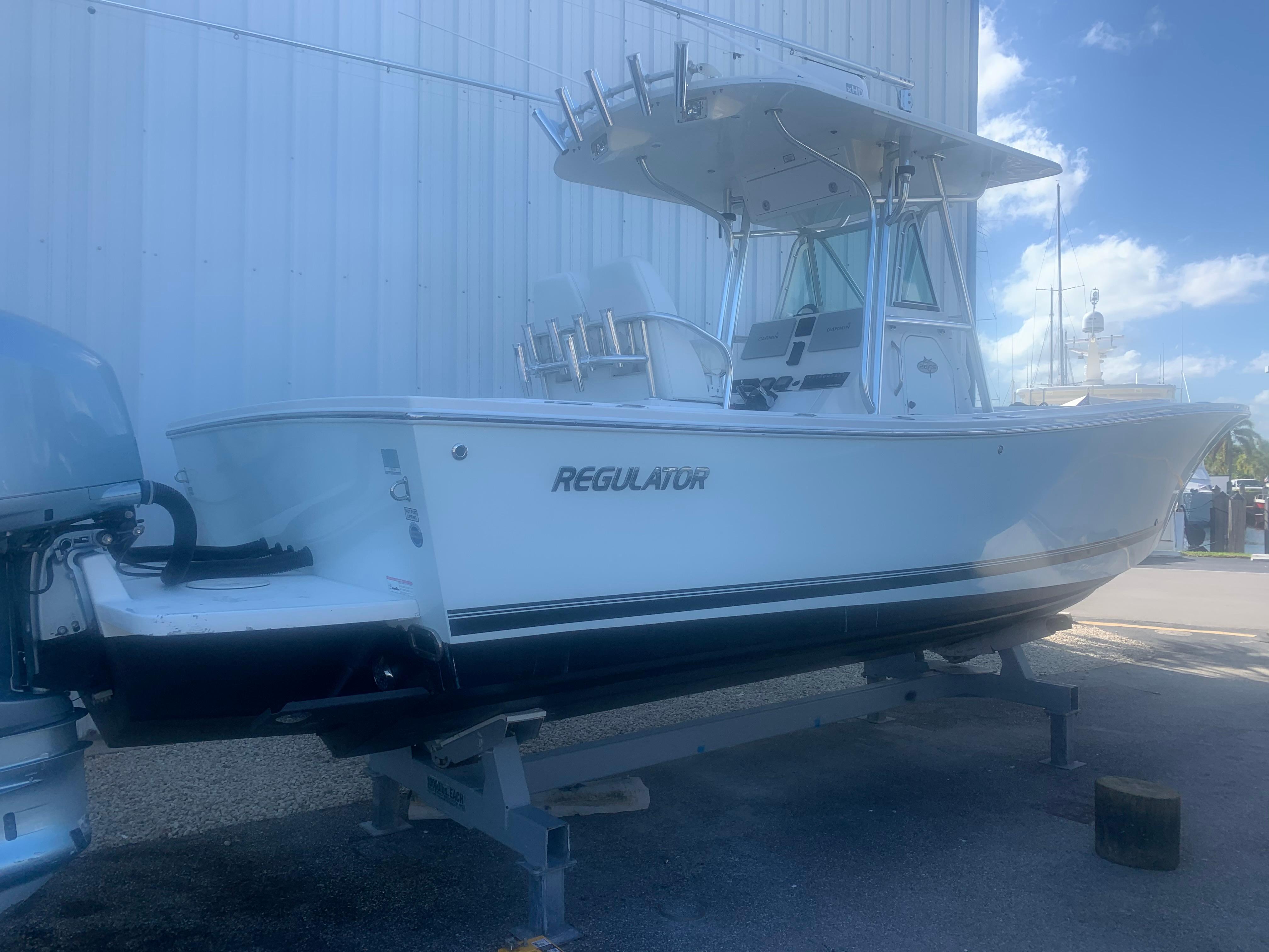 The original flagship of Regulator Marine, the 26 FS delivers aggressive performance, maneuverability and the legendary soft, dry ride for which Regulator is famous, thanks to its sharp bow entry and 24-degree deadrise. Regulator's exclusive Fiberglass Grillage System provides the strength and structural integrity that enables it to withstand the most challenging bluewater swells.The 26' is loaded with standards like a 64-quart console cooler under the forward seat; an all-fiberglass, stand-up head compartment with portable marine toilet; and pop-up cleats and bow lights. The optional SuperSport leaning post accommodates up to nine rods and features an integrated tackle storage system, built-in footrest and backrest. Other attractive options include a practical fiberglass T-Top with built-in 16-foot Lee Sidewinder outrigger bases, two 17-quart bait boxes, 20-gallon livewell in the transom and a vast 700-quart, in-deck wet/dry box that doubles as locking rod storage. The twin 250-hp Yamaha four-stroke engines deliver the speed and fuel economy to take you wherever you want to go.