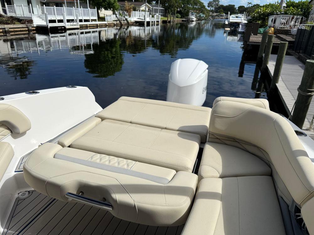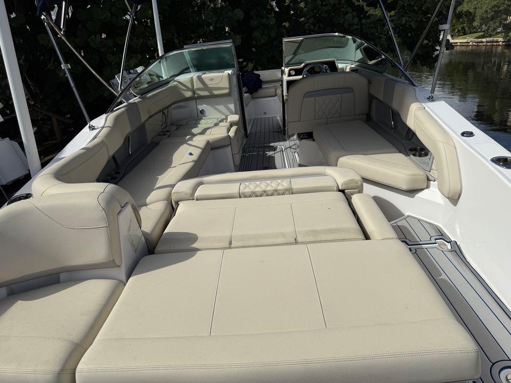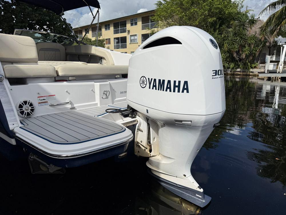 This 26-foot, versatile outboard bowrider designed for entertainment and cruising, featuring a spacious deck, versatile seating like the "Ultra Lounge," and a stepped hull for performance. It has a beam of 8' 6" and powered by a Yamaha 300, with a fuel capacity of 103 gallons.