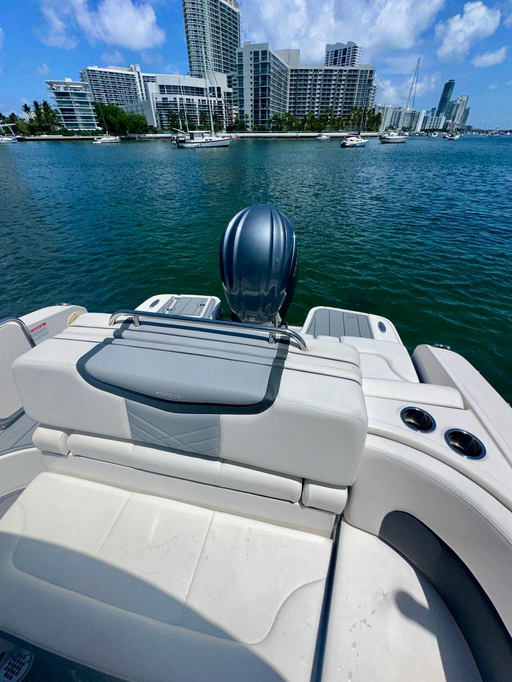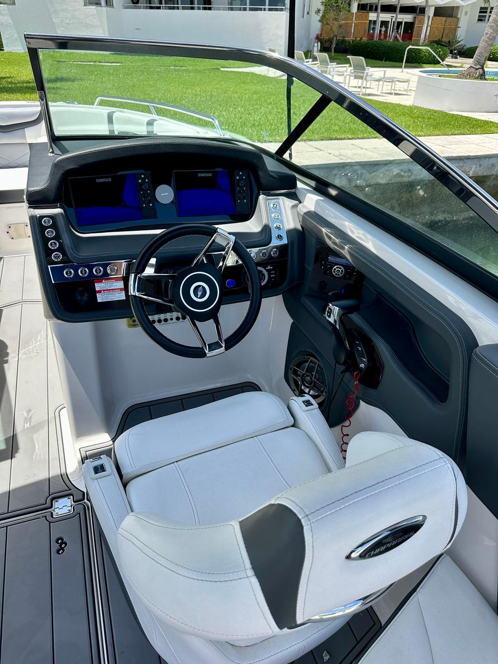 The 267 SSX Outboard is a trendsetter in design, performance, and function. The helm features an all new glass dash with dual touch screen displays. The cockpit is open, spacious and features a multi-position sun lounger aft. The open concept design carries forward into the bow area which features hinged storage beneath luxuriously appointed upholstery. Chaparral went to great lengths to create a powerful and agile craft that glides through the water with minimal noise. The 267 SSX Outboard was designed with the most advanced technology afloat today. With Dual Simrad 7" touch screen displays and Simard controls, is NMEA compatible and offers navigation, engine management, full gauge compliment, and can be customized to your personal preferences.