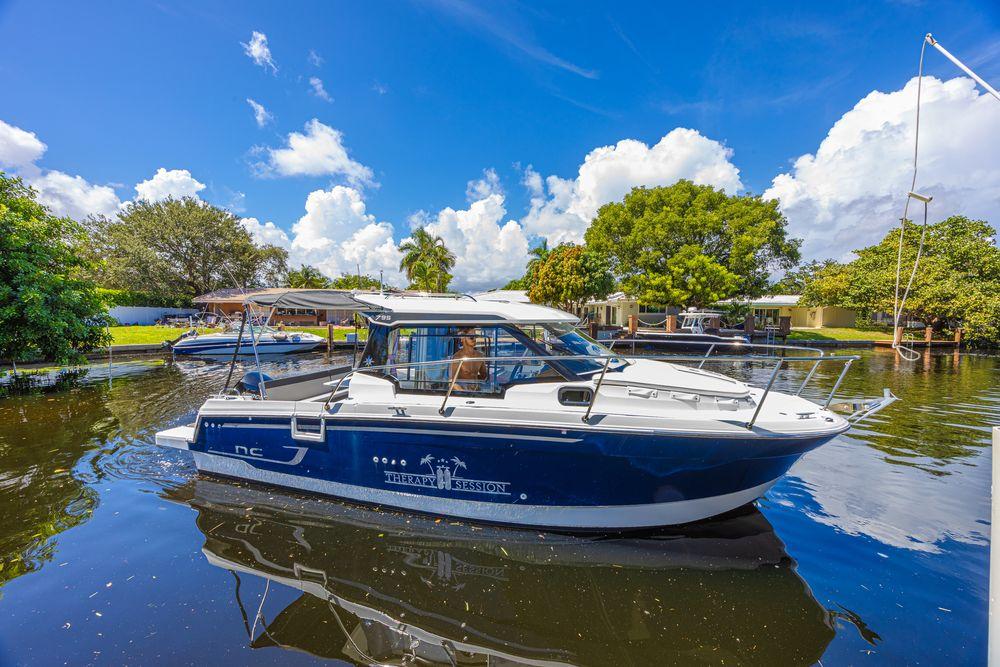 Powered by a Mercury 225hp FourStroke outboard with just 112 hours, “Therapy Session” offers quiet, confident cruising up to 38 knots. Her asymmetric walkaround layout gives safe, easy access to the bow, while the spacious cockpit invites social moments with adjustable seating, a removable dining table, and a retractable bimini for perfect sun or shade.