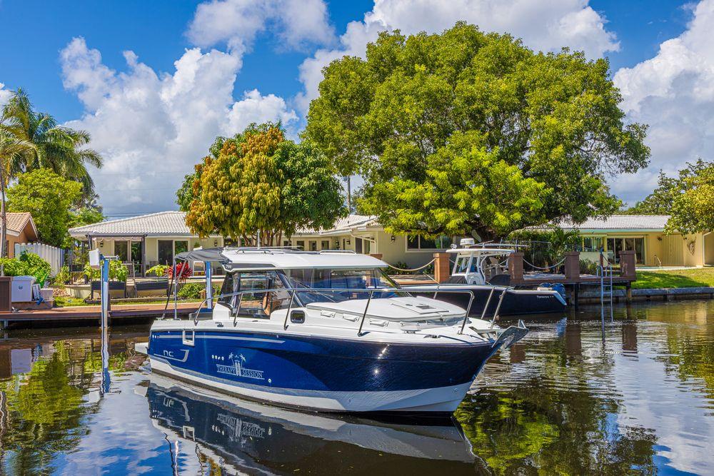 The Jeanneau NC 795 embodies European design with a versatile, modern profile. Her deep blue hull and sculpted lines turn heads at every marina, while the protected wheelhouse and open aft cockpit strike the perfect balance between comfort and adventure. The extended swim platforms and stainless-steel rails add both safety and style for family cruising or weekend escapes.