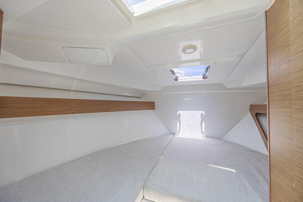 Inside, the NC 795 offers a bright, cozy cabin with a convertible V-berth, galley, and enclosed head compartment. Premium upholstery, wood accents, and practical storage create an inviting retreat after a day on the water. The enclosed marine head with sink and faucet ensures privacy and convenience for overnight stays.