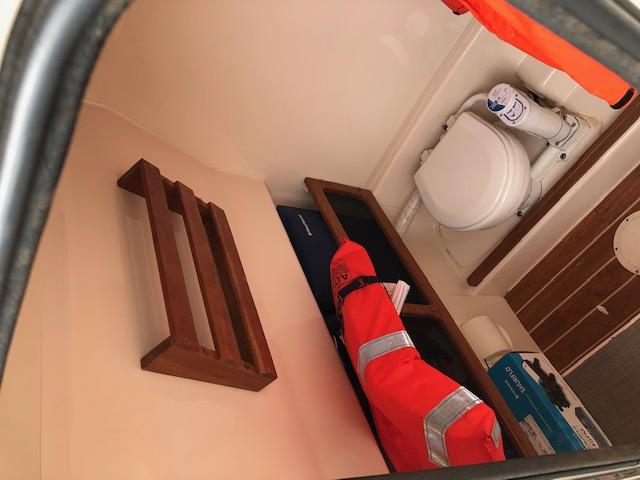 - Bathroom Under Helm w/ Electric Flush Toilet & Holding Tank Monitor