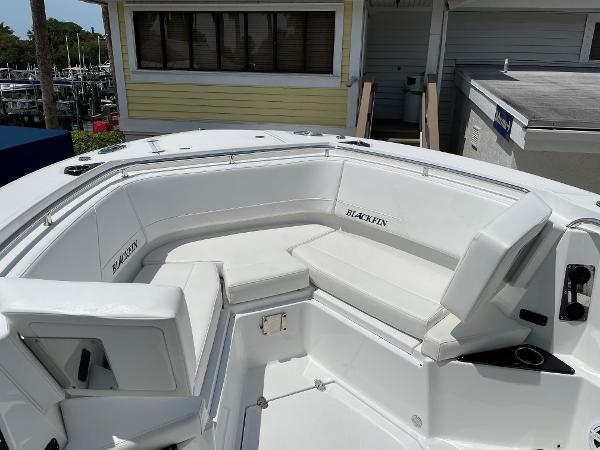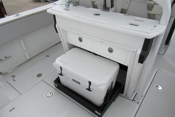 - Leaning Post, Fiberglass w/ Helm Seats & Flip-Up Bolsters, Pull-Out/Removable 45QT Yet Tundra Cooler, Sink w/Fresh Water Pull-Out Sprayer, Bait Prep Station w/Cutting Board, Drink Holders, Storage Drawers (2), & Slide Out Tackle Utility Boxes (4)