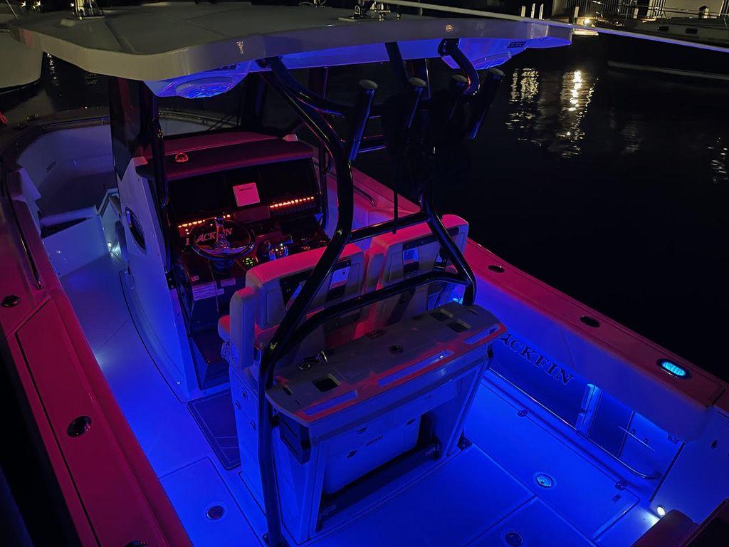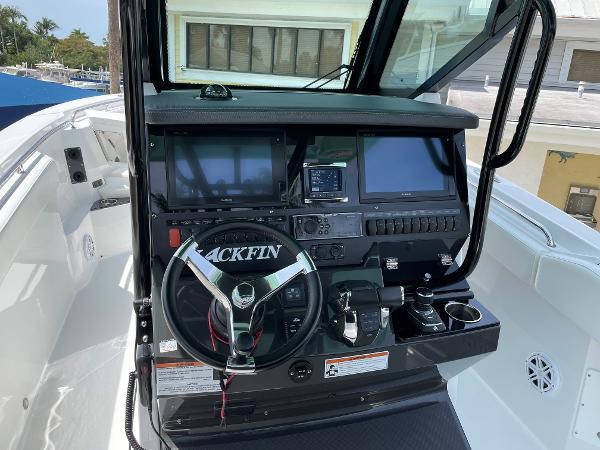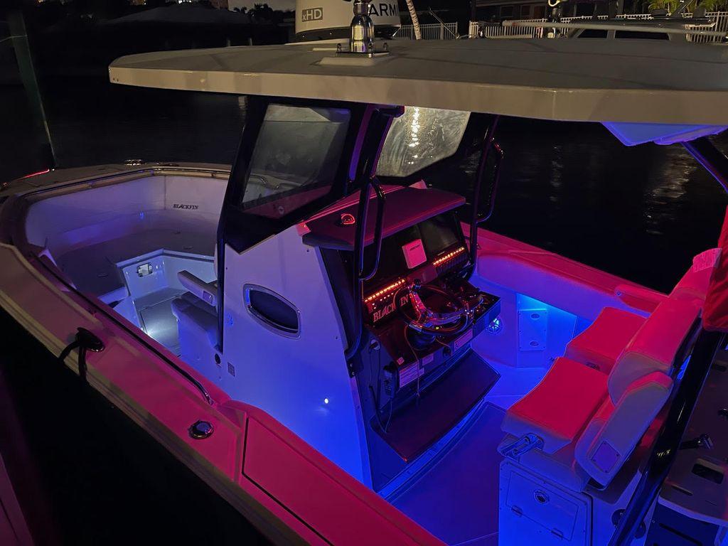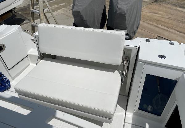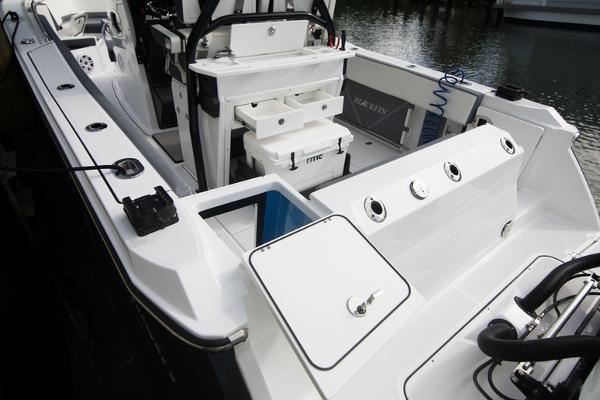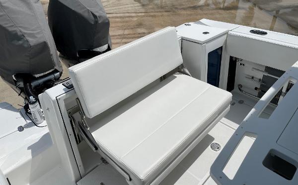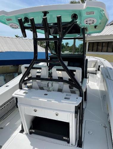 - Leaning Post, Fiberglass w/ Helm Seats & Flip-Up Bolsters, Pull-Out/Removable 45QT Yet Tundra Cooler, Sink w/Fresh Water Pull-Out Sprayer, Bait Prep Station w/Cutting Board, Drink Holders, Storage Drawers (2), & Slide Out Tackle Utility Boxes (4)