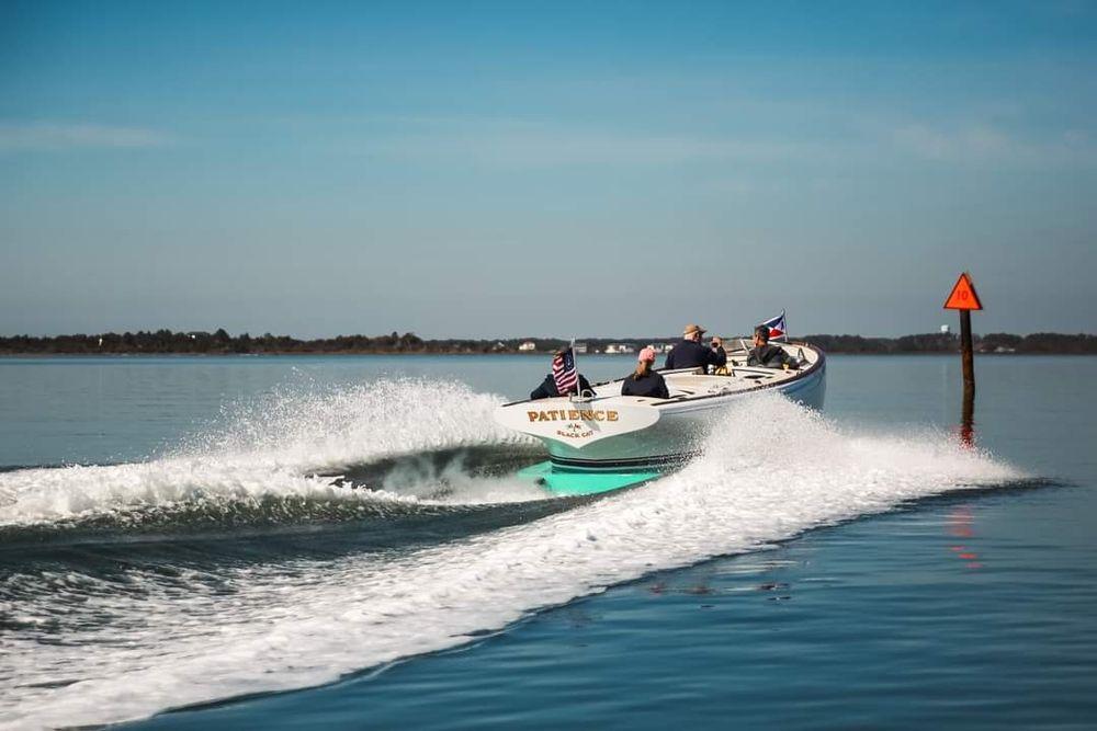 PATIENCE is a tribute to great yacht designers of the pre-war era. The ducktail in the transom is inspired by John H. Wells, who was well known for designing his fast-running commuters for Consolidated, Defoe, and the New York Launch and Engine Co. The transom is inspired by the legendary designer L. Francis Hereshoff while the bow is inspired by WWI battleships.