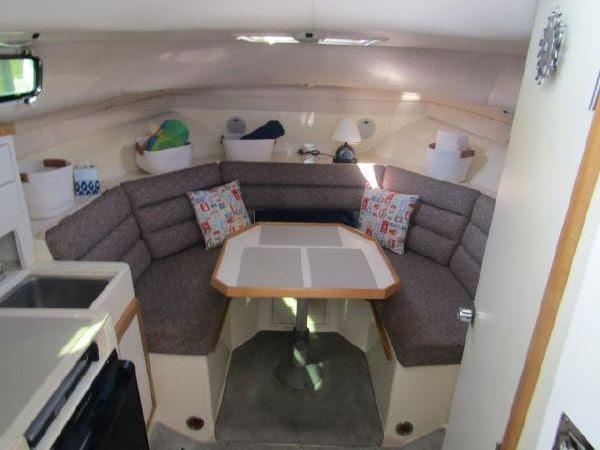 Convertible Dinette Forward Sleeps 2. This space also has an hanging locker. Overhead there is a Bowmar hatch which provides natural light.