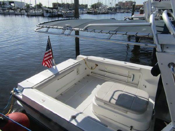 There are walk arounds with hand rails that allows for easy passage forward. The all fiberglass deck is very easy to maintain. Windlass is located on deck with foot controls.