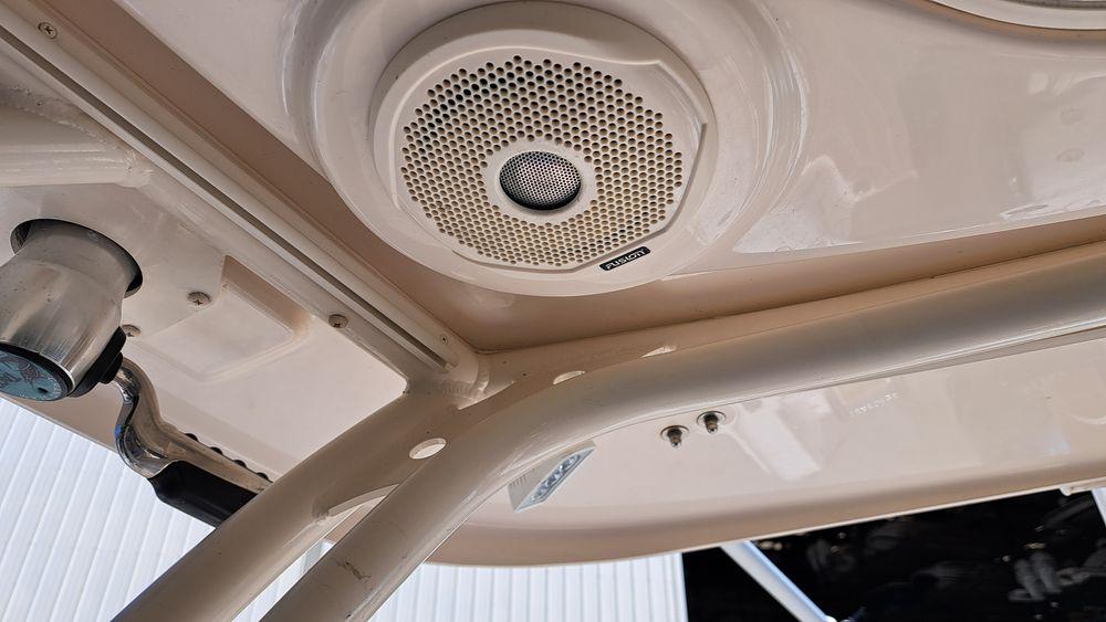 - Stereo system w/AM/FM tuner, MP3 auxiliary audio connections/amplifier, Bluetooth®, remote control & fold down storage; speakers - aft (2), bow (2) & hardtop (2)