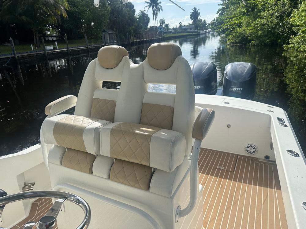 Large helm with dual seat bench with flip bolster seating, Electronics space for large displays, T-Top with fiberglass hardtop and windshield, Stainless steel steering wheel with knob, Tackle center with storage under helmseat and slide out cooler.
