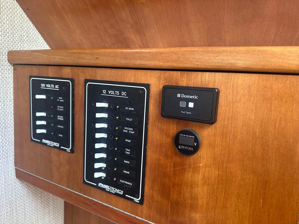LED technology for all lighting, C Zone digital distribution system, AGM deep cycle house battery bank, Two AGM engine starting batteries, Battery charger. Battery switches with paralleling, Fully bonded electrical system, 30 amp Dockside Shorepower with AC/DC distribution. Stereo with bluetooth, iPod controls, fore and aft speakers.