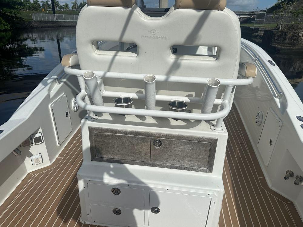Large helm with dual seat bench with flip bolster seating, Electronics space for large displays, T-Top with fiberglass hardtop and windshield, Stainless steel steering wheel with knob, Tackle center with storage under helmseat and slide out cooler.